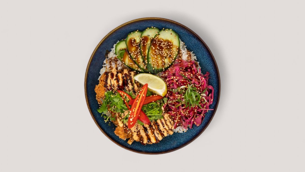 Vegan Asian BBQ Rice Bowl sisältää rapeaksi friteerattua seitania, tahmeaa Asian BBQ-kastiketta, hainanilaista riisiä, seesami-slawta, kurkkua, tuoretta punaista chiliä, korianteria, makeaa unagi-soijakastiketta ja vegaanista srirachamajoneesia.