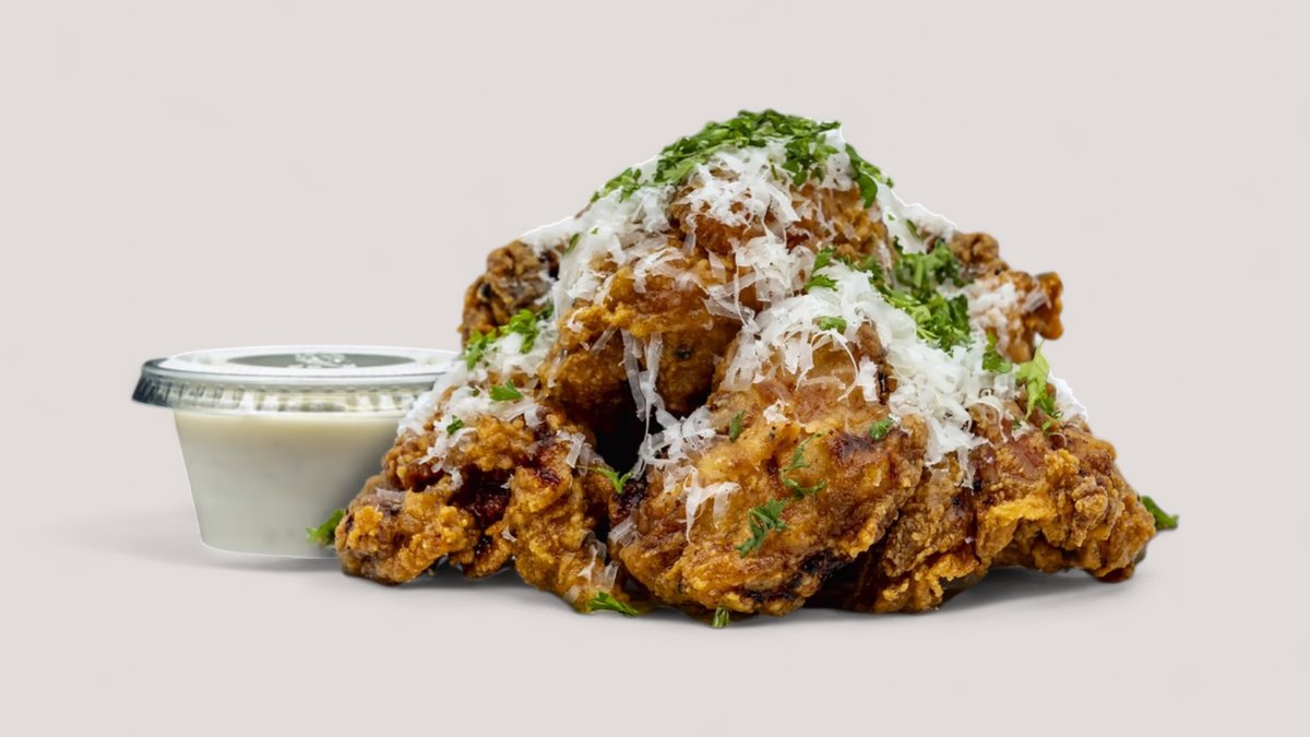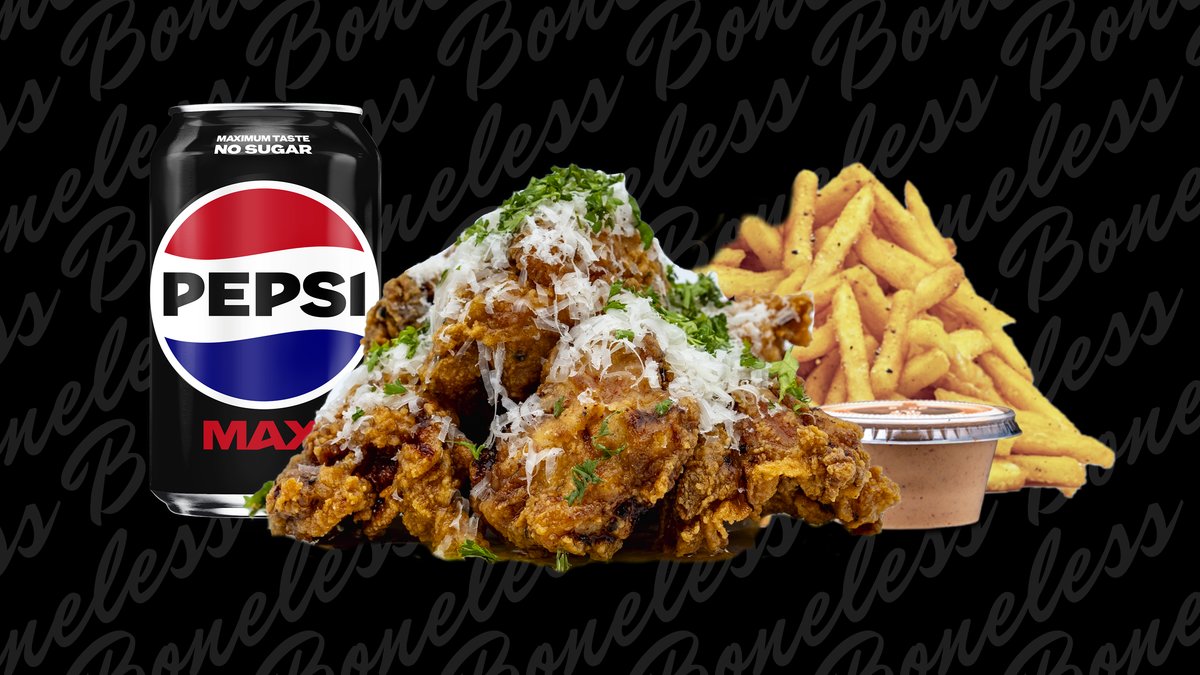 Annos sisältää 250g rapeaksi friteerattuja luuttomia kanapaloja (raakapaino ennen paistoa), Bonelessin valkosipulivoita, reilusti raastettua parmesan-juustoa, persiljaa, limelohkon, kurkku-ja porkkanatikkuja sekä valitsemasi dipin. Boneless Fried Chicken-kanapalat leikataan luuttomasta broilerin koipireidestä. Kanapalat piimämarinoidaan ja leivitetään käsin jauhoseoksessa. Annos sisältää gluteenia ja sitä ei pystytä valmistamaan gluteenittomasti.