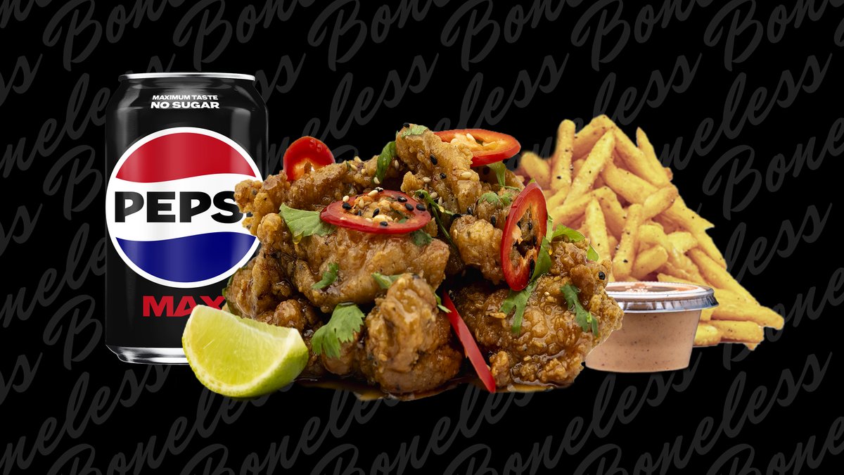 Annos sisältää 250g rapeaksi friteerattuja luuttomia kanapaloja (raakapaino ennen paistoa), Bonelessin makeaa Asian BBQ palmusokerikaramelli-kastiketta, tuoretta punaista chiliä, korianteria, limelohkon, kurkku-ja porkkanatikkuja sekä valitsemasi dipin. Boneless Fried Chicken-kanapalat leikataan luuttomasta broilerin koipireidestä. Kanapalat piimämarinoidaan ja leivitetään käsin jauhoseoksessa. Annos sisältää gluteenia ja sitä ei pystytä valmistamaan gluteenittomasti.