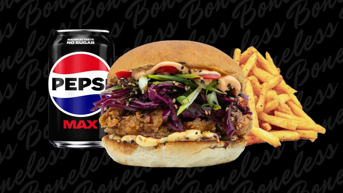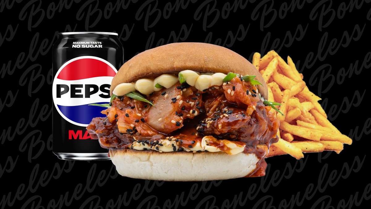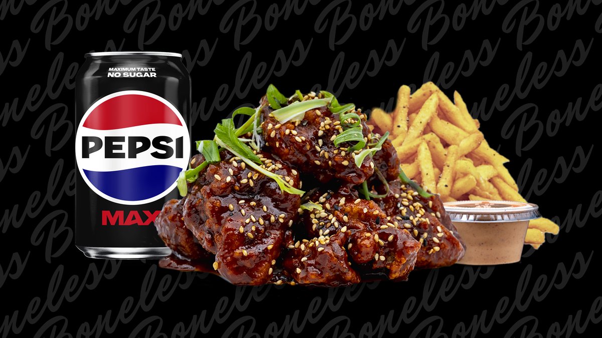 Ateria sisältää normaalin annoksen asian BBQ boneless fried chicken-kanapaloja, dipin, ranskalaiset ja virvoitusjuoman. Asian BBQ boneless fried chicken-kanapalat sisältävät 250g rapeaksi friteerattua luutonta kanaa (raakapaino ennen paistoa), bonelessin tahmaista asian BBQ-kastiketta, tuoretta punaista chiliä, korianteria, limelohkon, porkkana-ja kurkkutikkuja. Boneless fried chicken-kanapalat leikataan luuttomasta broilerin koipireidestä. Kanapalat piimämarinoidaan ja leivitetään käsin jauhoseoksessa. Annos sisältää gluteenia ja sitä ei pystytä valmistamaan gluteenittomasti.