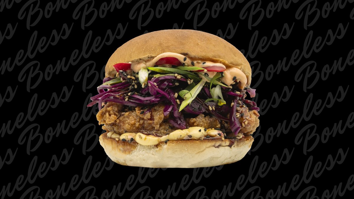 Asian BBQ Chicken Burger sisältää rapeaksi friteerattua broilerin koipireittä, Bonelessin tahmaista Asian BBQ-kastiketta, seesami-slawta, tuoretta punaista chiliä, seesaminsiemeniä, kevätsipulia ja srirachamajoneesia.