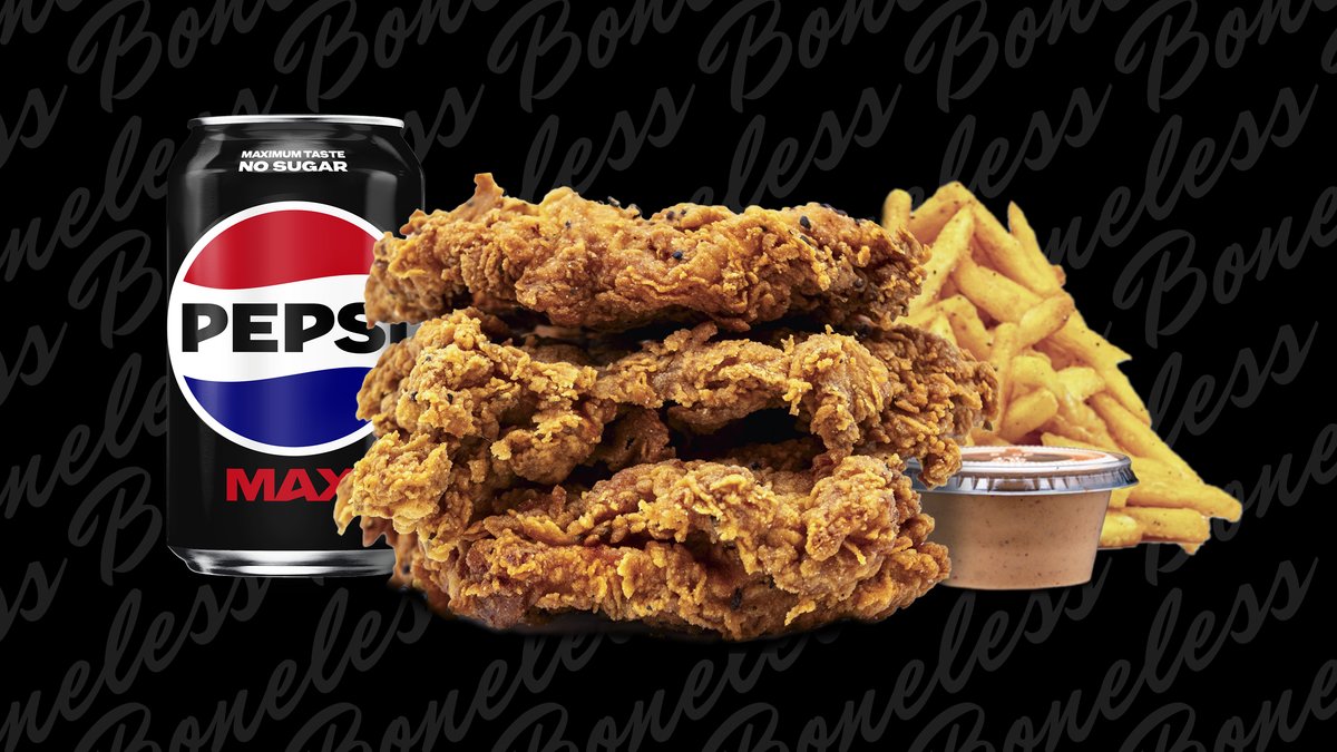 Annos sisältää 800g rapeaksi friteerattua kanaa (raakapaino ennen paistoa), isot ranskalaiset ja kolme dippiä. Original Boneless Fried Chicken sisältää kokonaisia luuttomia broilerin koipireisipaloja, jotka piimämarinoidaan ja leivitetään jauhoseoksessa. Annos sisältää gluteenia ja sitä ei pystytä valmistamaan gluteenittomana.