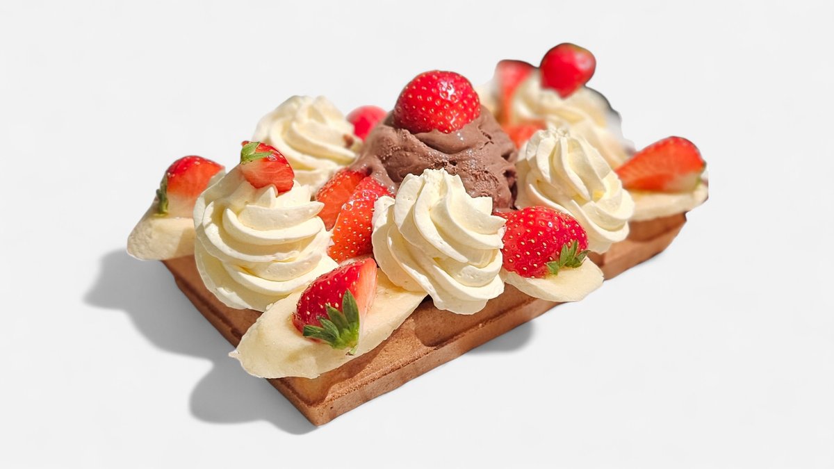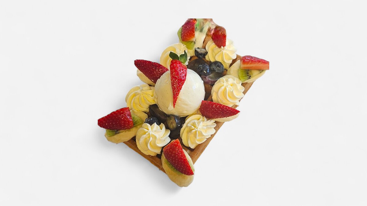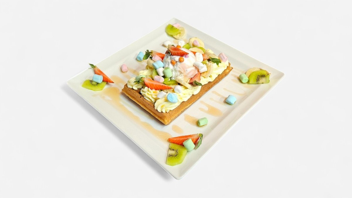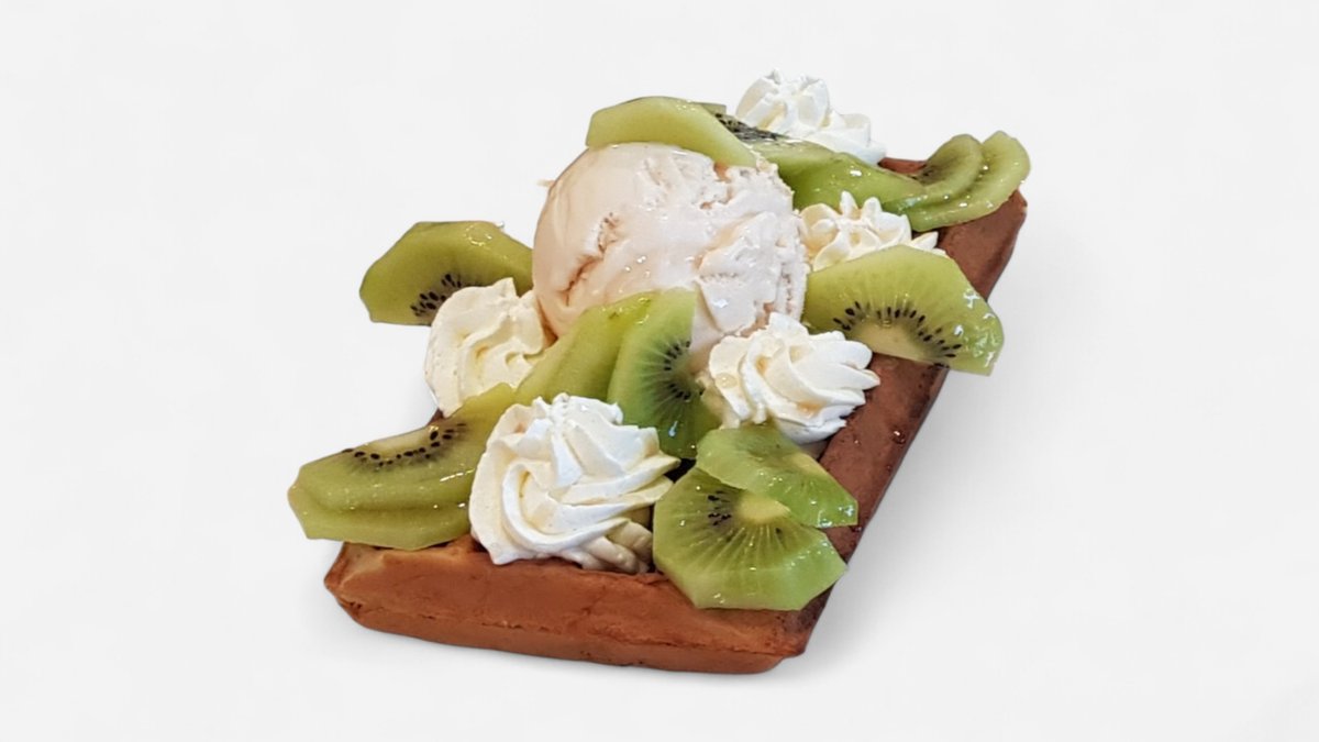Hedelmävohveli kastikkeella, ja kermavaahdolla, mutta ilman jäätelöä. Vaahterasiirappi, kiivi, kermavaahto. Tuotekuvassa on normaali annos (ei lasten).