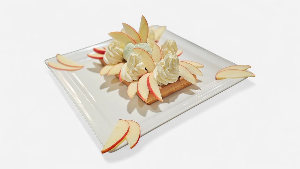 Hedelmävohveli kastikkeella, ja kermavaahdolla, mutta ilman jäätelöä. Vaahterasiirappi, omena, kermavaahto.