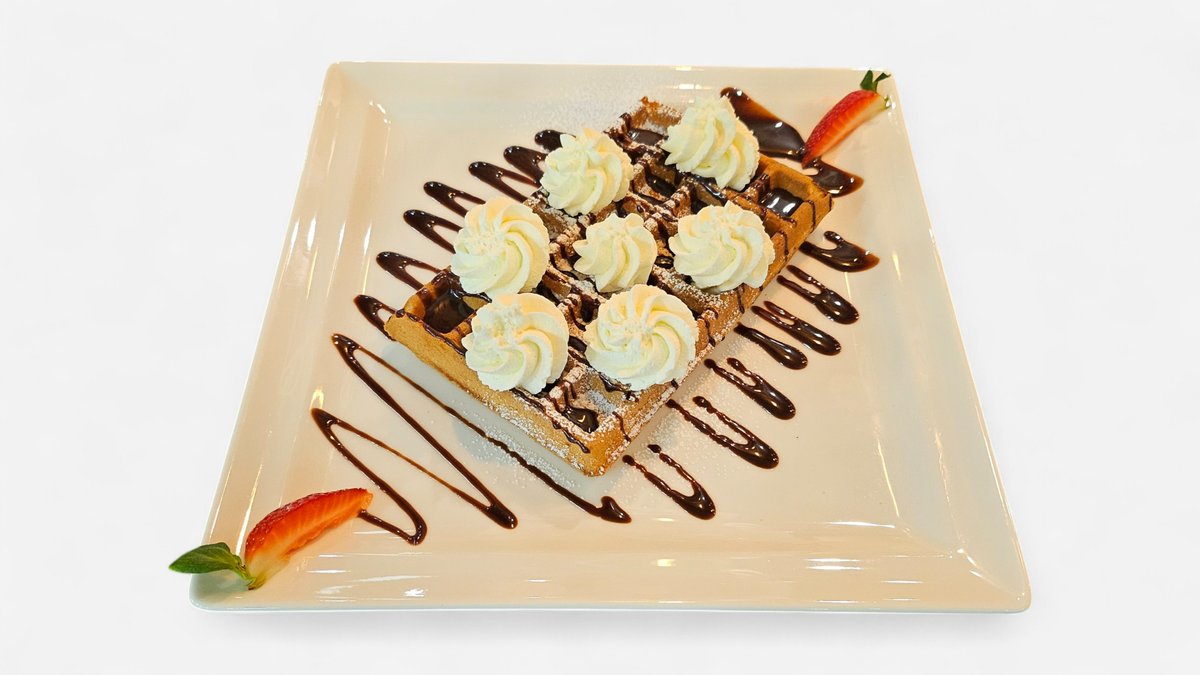 Hedelmävohveli kastikkeella, ja kermavaahdolla, mutta ilman jäätelöä. Suklaakastike, banaani, kermavaahto. Tuotekuvassa on normaali annos (ei lasten).