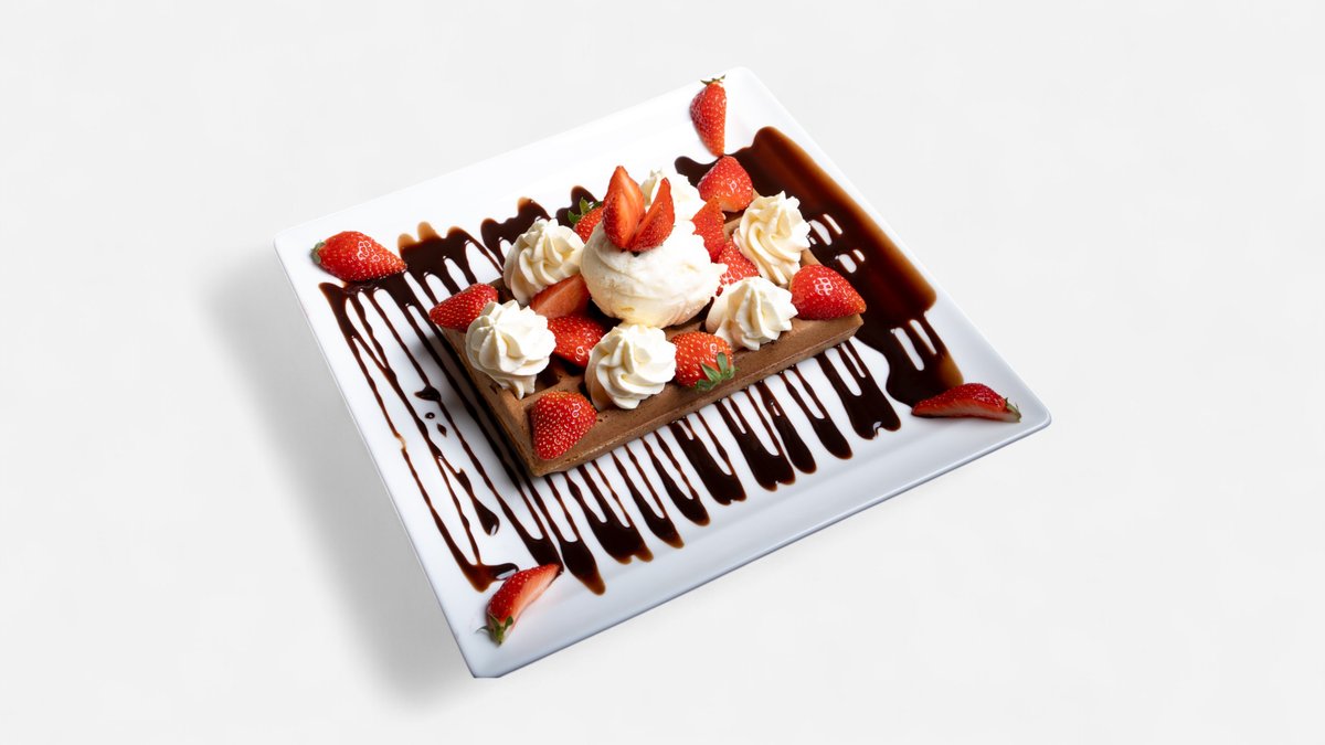 Suklaakastike, mansikat, kermavaahto, vaniljajäätelö. Tuotekuvassa on normaali annos (ei lasten).