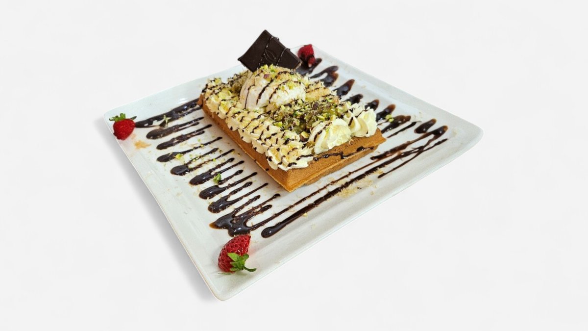 Suklaakastike, pistaasitahna, kataifi, kermavaahto, jäätelö. Tuotekuvassa on normaali annos (ei lasten).