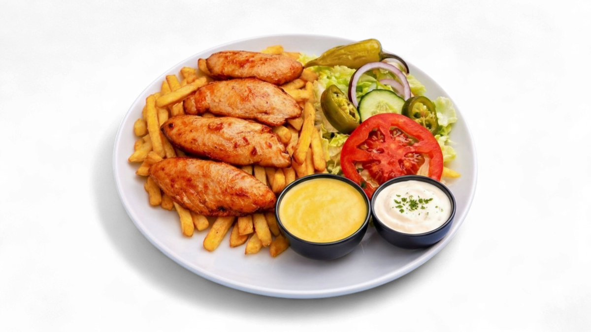Kananrintafile ranskalaisilla Grillattu kananrintafile ranskalaisten päällä. Salaatti, tomaatti, suolakurkku, pepperoni ja jalapeño. Tarjoillaan curry- ja valkosipulikastikkeen kanssa