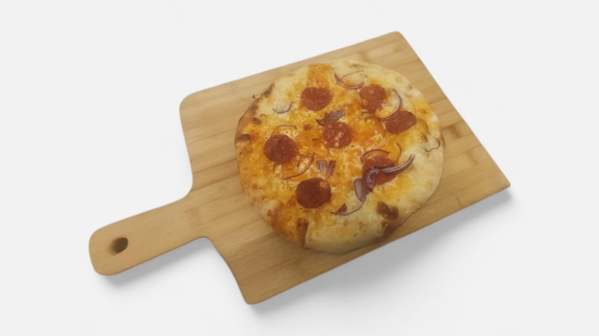 Salami, paahdettu paprika, punasipuli, paholaisenkastike, rucola