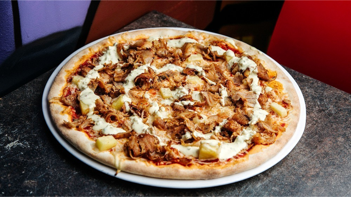 Kebab, pepperoni, ananas, aurajuusto, ranskalaiset, valkosipulimajoneesi