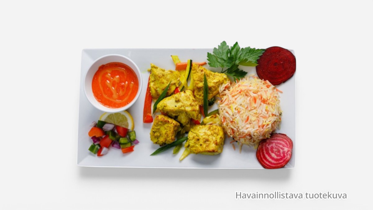 Yrttijogurtissa marinoituja ja tandooruunissa paistettua kanan rintapaloja, sipulia, paprikaa ja tuoretomaattia.