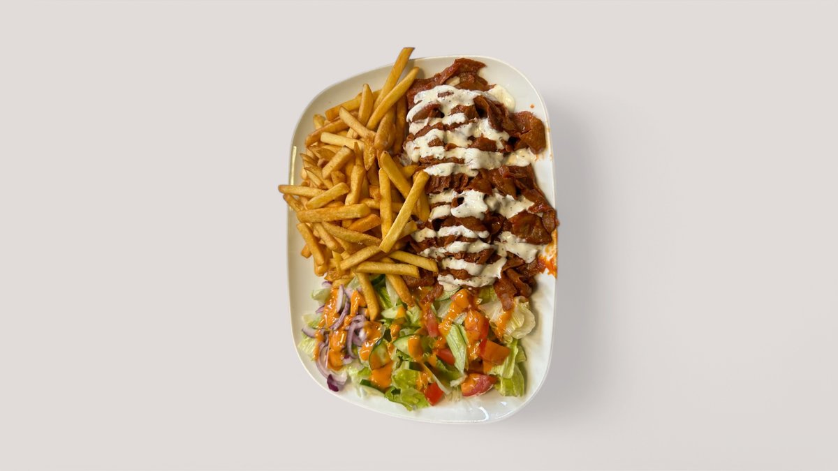 Kebab, jalapeno, salaatti, ranskalaiset, tomaatti kurkku, tulinen kastike, chili, majoneesi