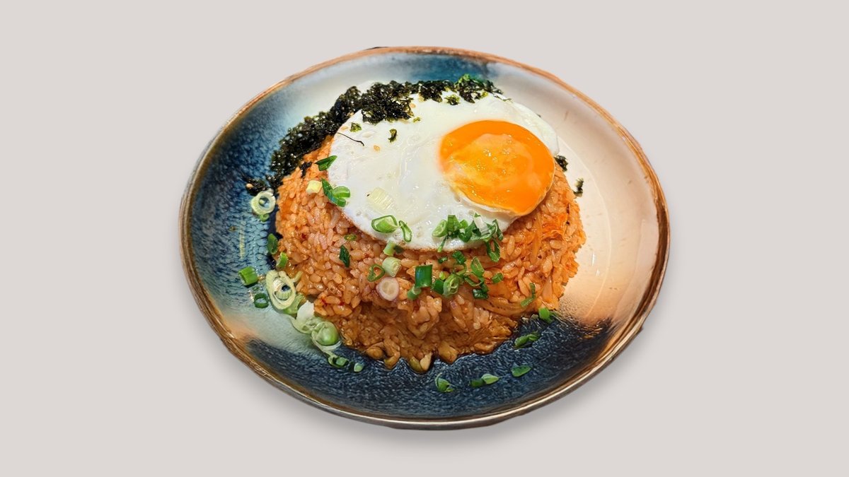 Fried Rice Kotimaisesta kanasta, Kimchiä, sunny side up-kananmunaa, kevätsipulia, seesaminsiemeniä, chiliä, paahdettua lehtikaalia ja korianteria sekä talon Soul Survivor-kastikketta