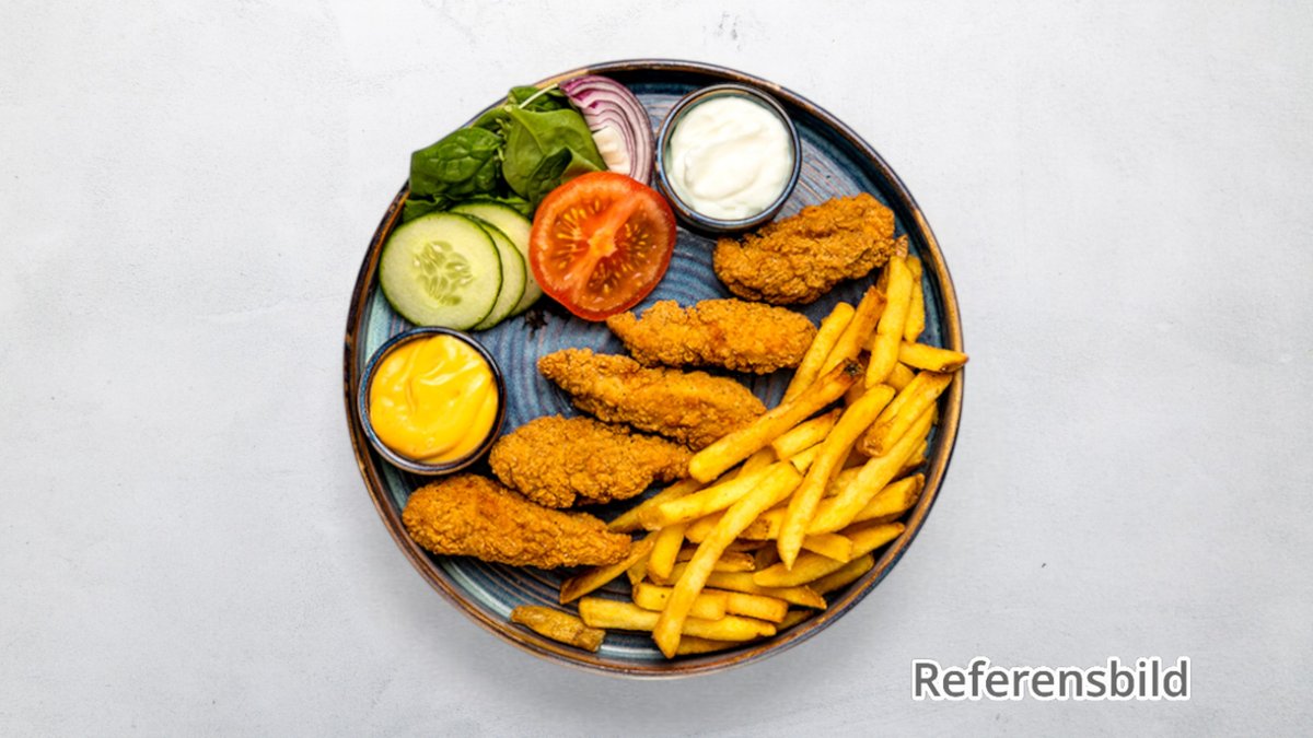 Serveras med pommes frites.