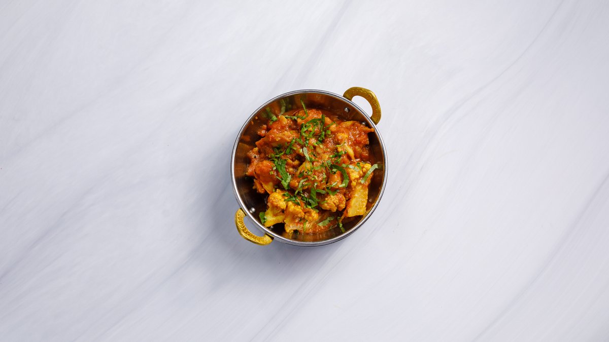 Potatis-och blomkålsrätt med lök, tomat, ingefära, kummin, chili och koriander.