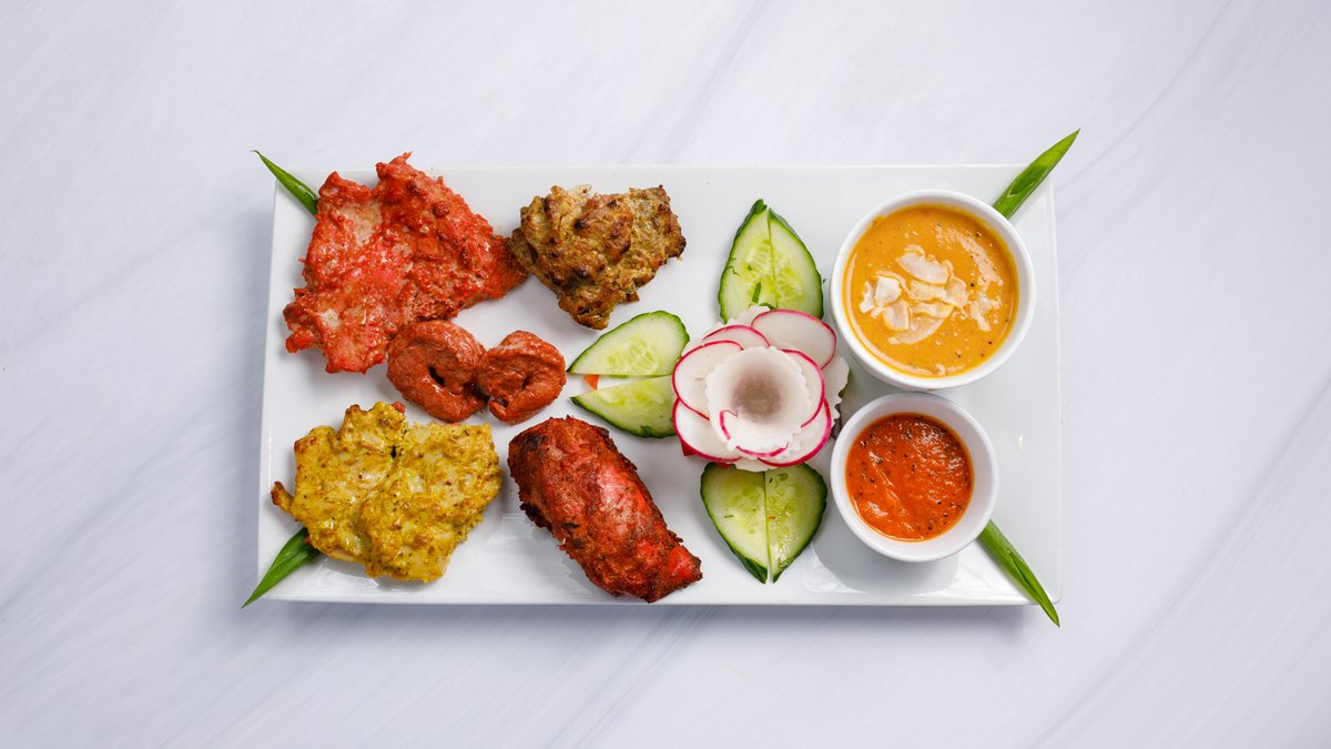 En blandning av olika grillrätter. Räkor, chicken tikka, lasuni och sunehra gosht.
