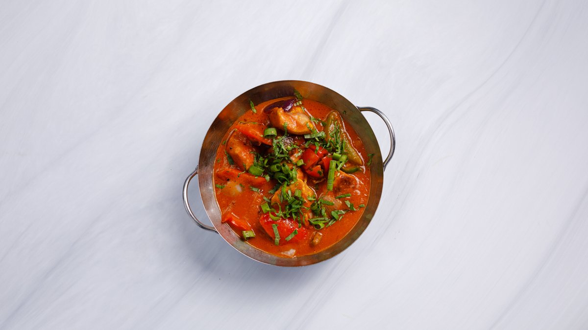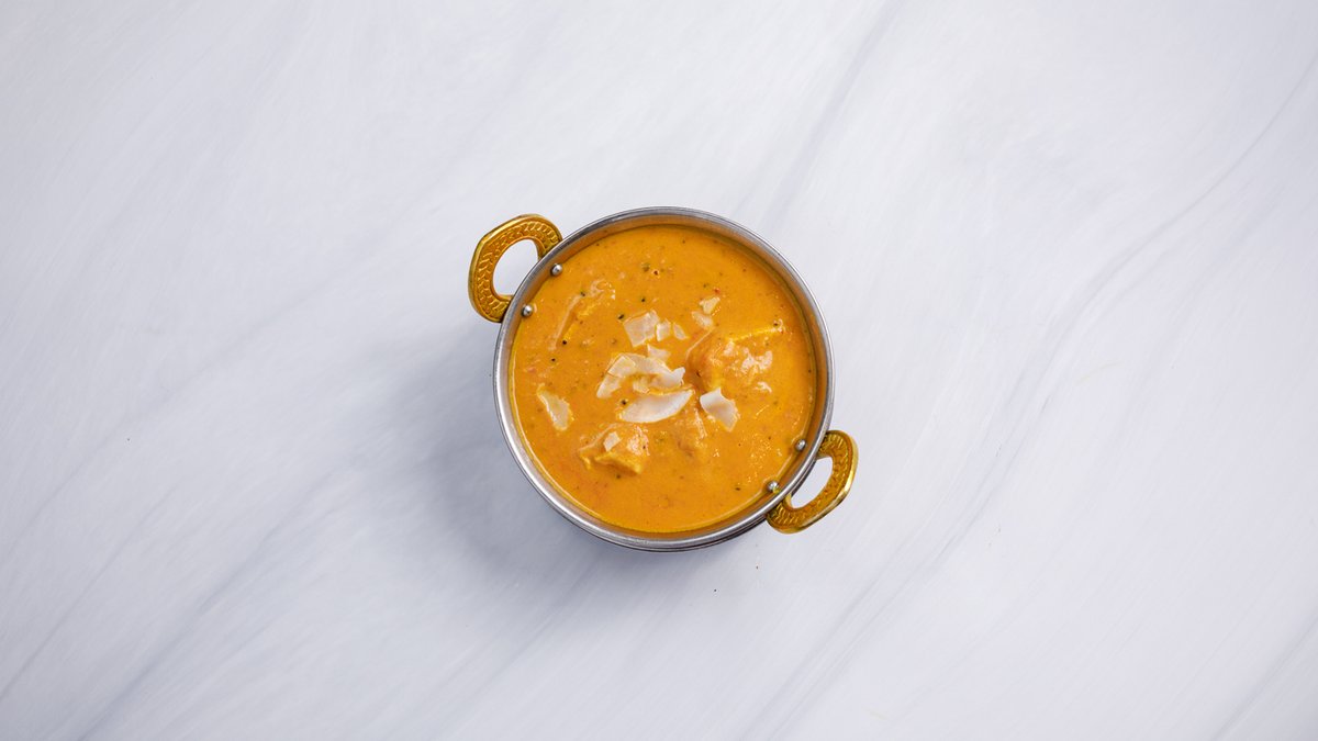 Sydindisk kycklinggryta med doft av curryblad och koriander i het kokos masalasås.