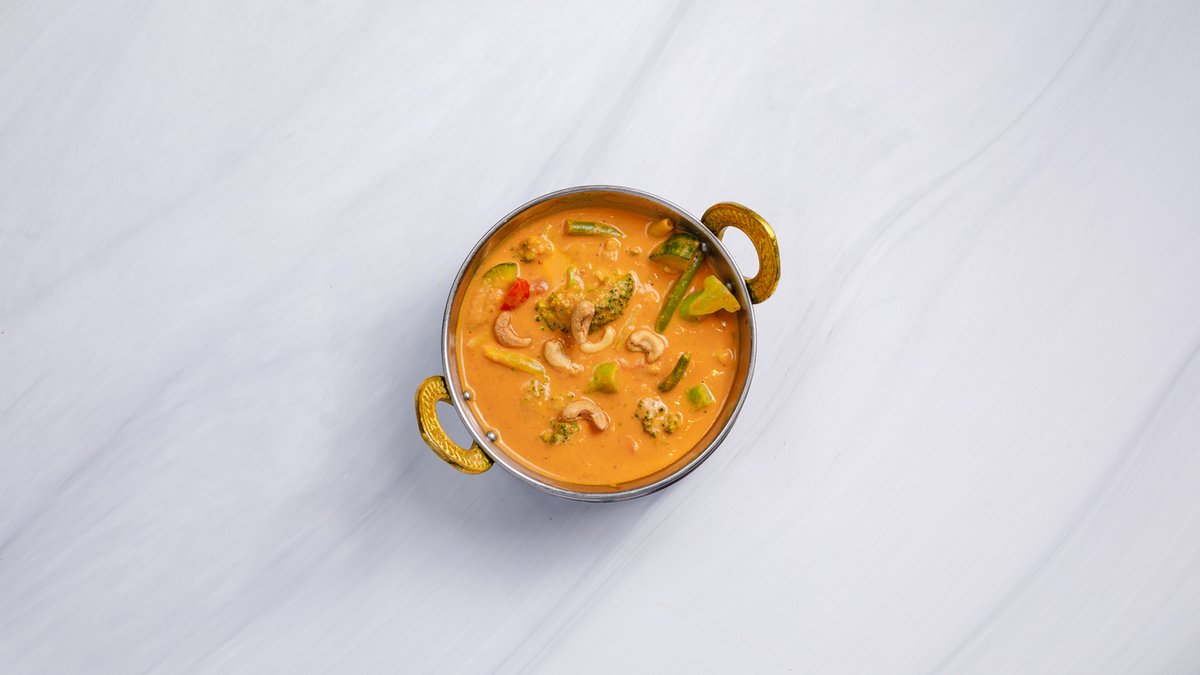 Olika sorters grönsaker i mild krämig currysås. Toppad med cashewnötter.