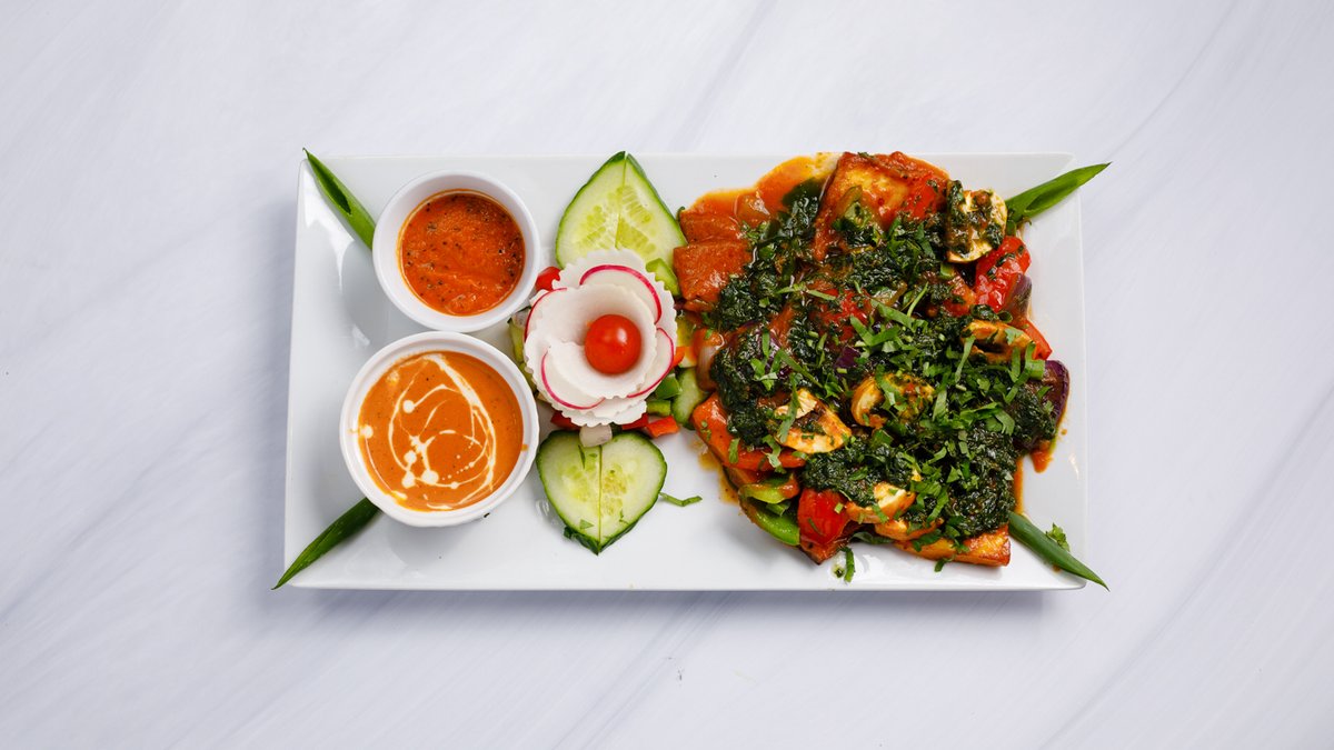 Marinerad, grillad färskost, fylld med korianderchutney. Serveras med tandoorigrillad lök, paprika, champinjoner och krämig lök-och tomatsås.