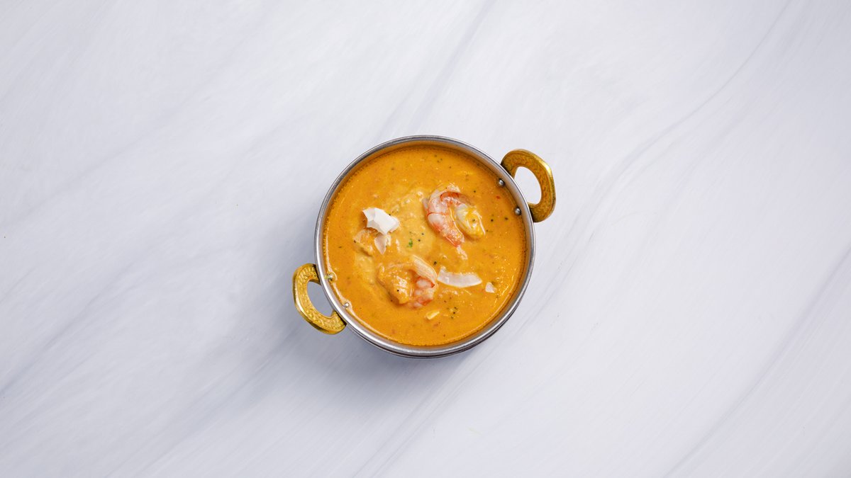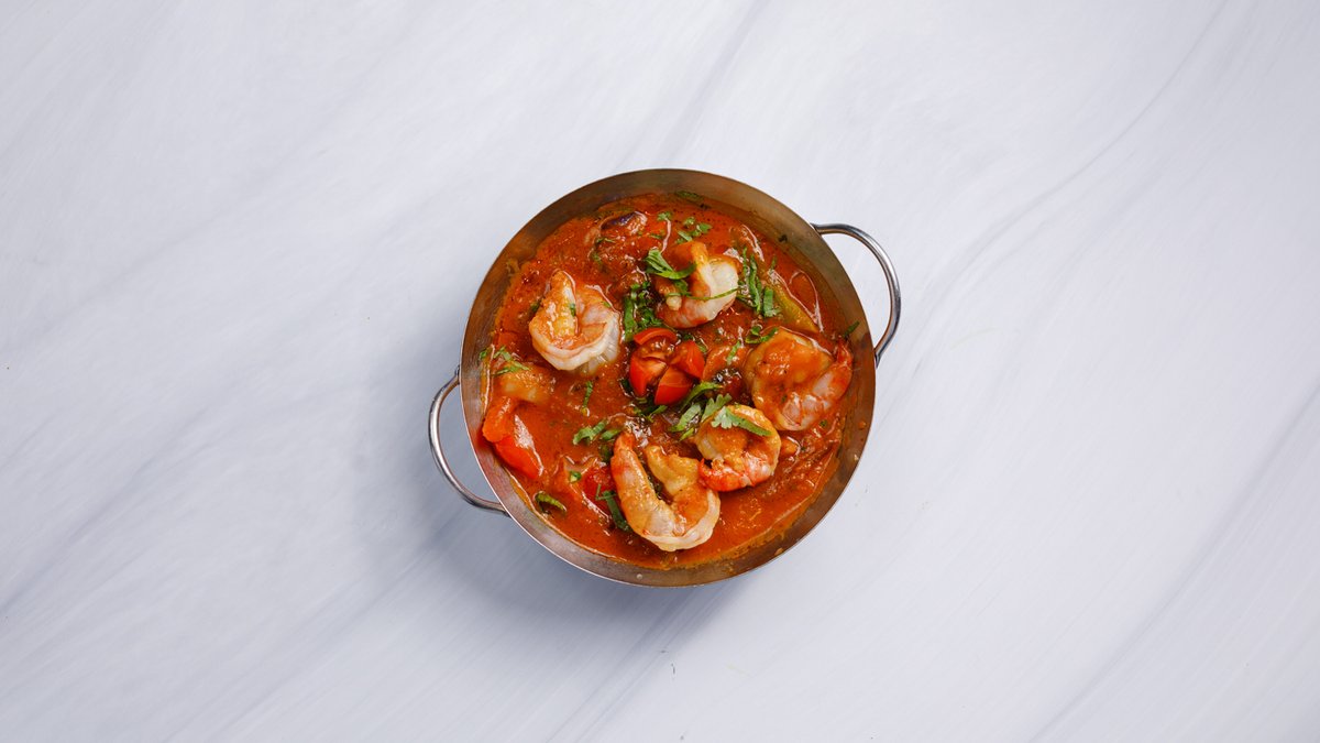 Sydindisk gryta med räkor, curryblad och koriander i het kokos masalasås.