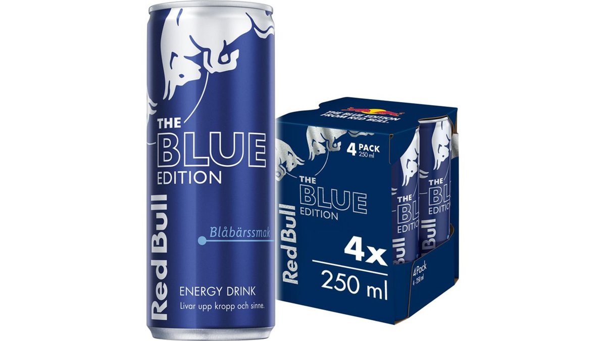 OM PRODUKTEN: - Red Bull Energy Drink Blue Edition 250ml 4-pack - Det speciella receptet för Red Bull Energidryck med smak av blåbär innehåller ingredienser av högsta kvalitet: koffein, taurin, B-vitaminer, sockerarter, vatten. - En burk Red Bull Energidryck blåbärssmak 250ml innehåller 80mg koffein, ungefär samma mängd som i en kopp kaffe. - Mängden socker i en burk Red Bull Energidryck blåbärssmak motsvarar sockerhalten i en lika stor mängd äppel- eller apelsinjuice - 11g per 100ml. - Red Bulls burkar är gjorda av 100% återvinningsbar aluminium. - Livar upp kropp och sinne. RED BULL GER DIG VINGAR I mitten av 1980-talet grundade Dietrich Mateschitz Red Bull, inspirerad av funktionsdrycker från fjärran östern. Han utvecklade inte enbart en ny produkt, utan även ett unikt marknadsföringskoncept och lanserade Red Bull Energidryck den 1:a april, 1987. En helt ny produktkategori föddes - energidryck. KONSUMTIONSTILLFÄLLEN Red Bulls energidrycker är uppskattade över hela världen av toppidrottare och studenter, under krävande arbetsdagar och vid långa bilkörningar. INUTI BURKEN Koffein: Koffein har använts för dess stimulerande effekt på människokroppen sedan urminnes tider och finns naturligt i över 60 växter. Koffein har bland annat förmågan att ge en ökad känsla av vakenhet och bidrar till att stimulera koncentrationsförmågan. En burk Red Bull Energy Drink 250ml innehåller 80mg koffein. Taurin: Taurin är en aminosyra som utgör ett naturligt inslag i människokroppen. Taurin förekommer i den dagliga kosten och hjälper till i flera olika biologiska processer. B-vitaminer: Vitaminer är livsviktiga mikronäringsämnen som behövs för att vi ska kunna upprätthålla våra normala kroppsfunktioner. Sockerarter: Sockret i Red Bull Energidryck kommer från sockerbetor. Vatten är en huvudingrediens i Red Bull.