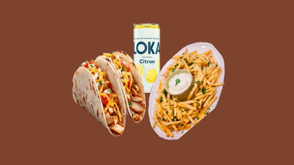 En krispig street food-favorit! kycklingtaco, serverad med gyllene pommes frites och krämig aioli. Ingår läsk. Perfekt för en snabb och mättande måltid. ● 2 Kyckling tikka taco ● Pommes frites med aioli ● Läsk 33 cl