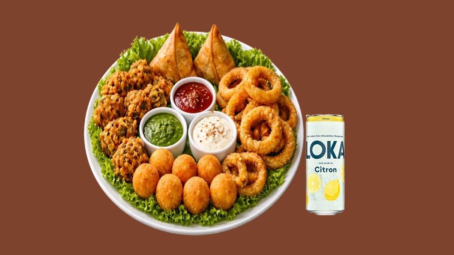 Den perfekta förrätten att dela! En mix av krispig samosa, pakora samt ditt val av cheese balls eller lökringar. Serveras med två goda dippsåser. ● 2x Samosa ● Mix Pakora ● Cheese balls eller Lökringar ● 2 dippsåser