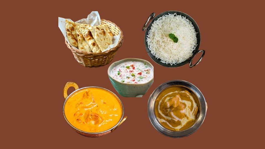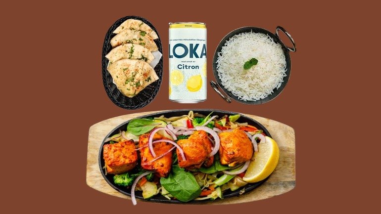 En exklusiv fisk- och skaldjursupplevelse. Smakrik fish curry och kryddig jheenga kadahi, serverad med basmatiris, naan och raita. ● Fish Curry ● Jheenga Kadahi (räkor) ● 2 × Basmatiris ● 2 × Naan ● Raita