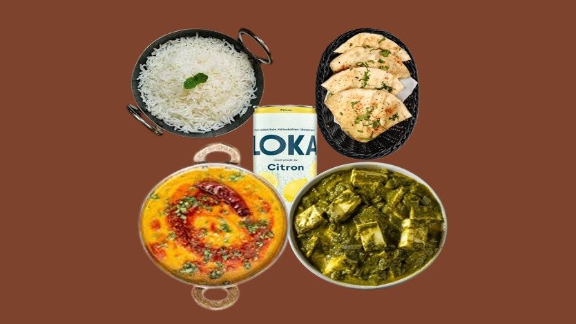 En smakrik vegetarisk fest för två! Krämig palak paneer och klassisk dal tarka, serverat med basmatiris, naan och raita. ● Palak Paneer ● Dal Tarka ● 2 × Basmatiris ● 1 x Naturell naan ● Raita ● 2 x Läsk 33cl