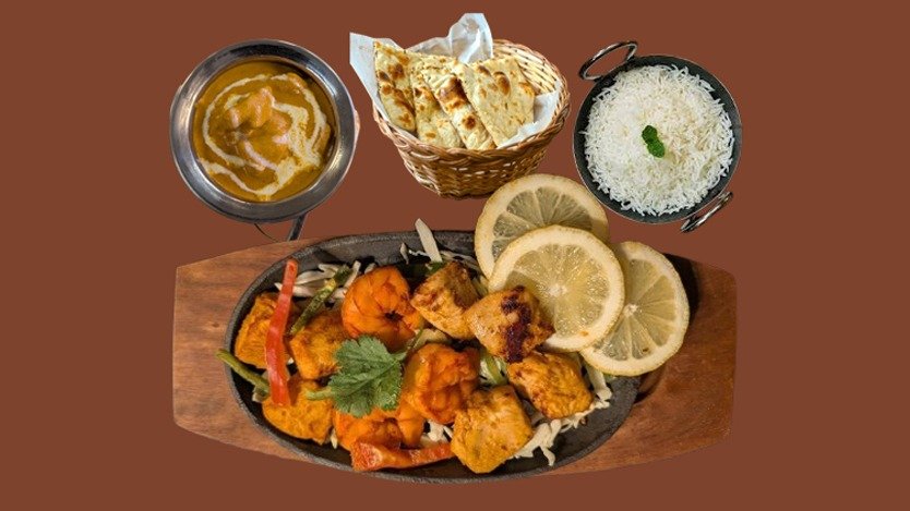 Grillade rätter serveras rykande heta på järnfat med tikka masalasås och basmatiris.