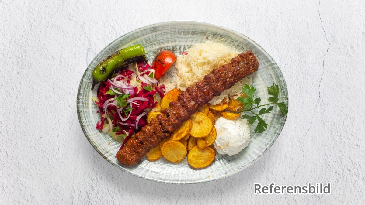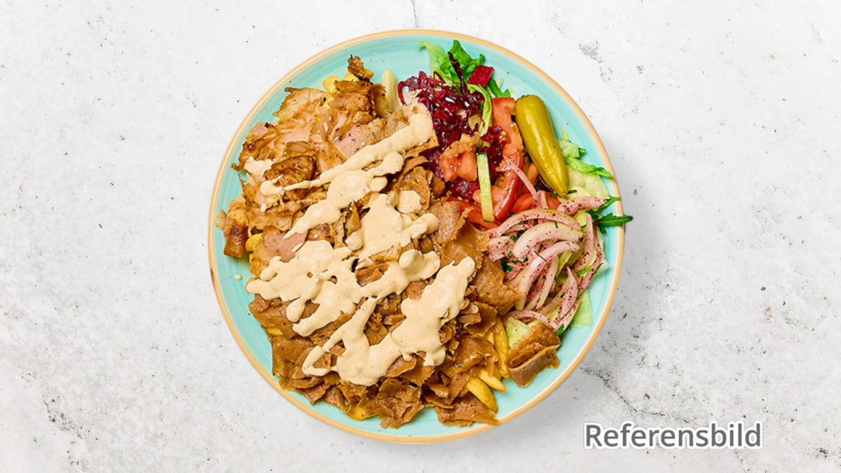 Kebabkött (nötkött), sallad, pommes frites och blandad kebabsås.