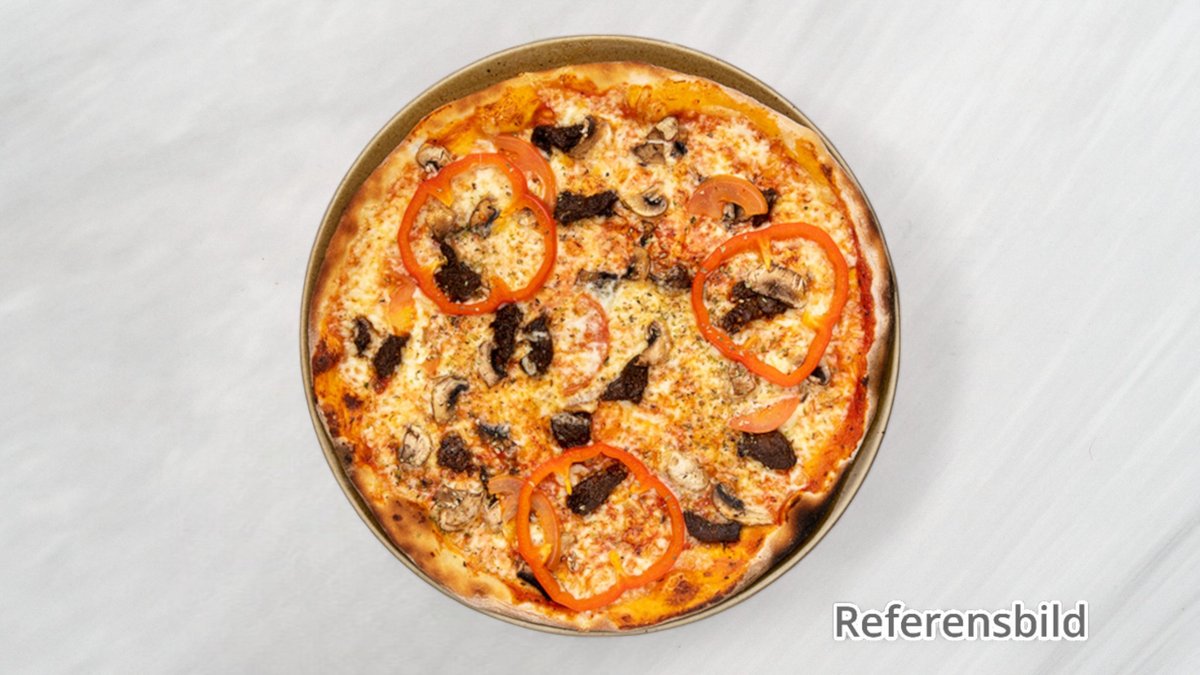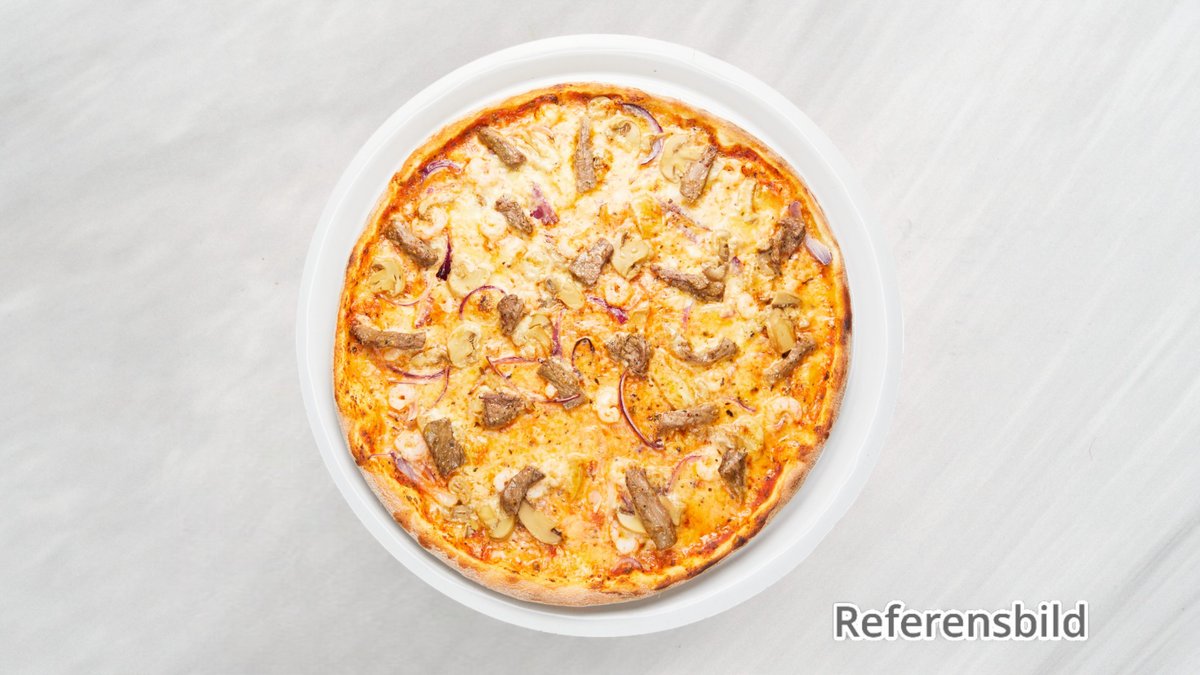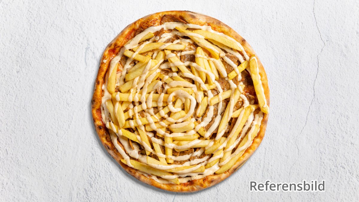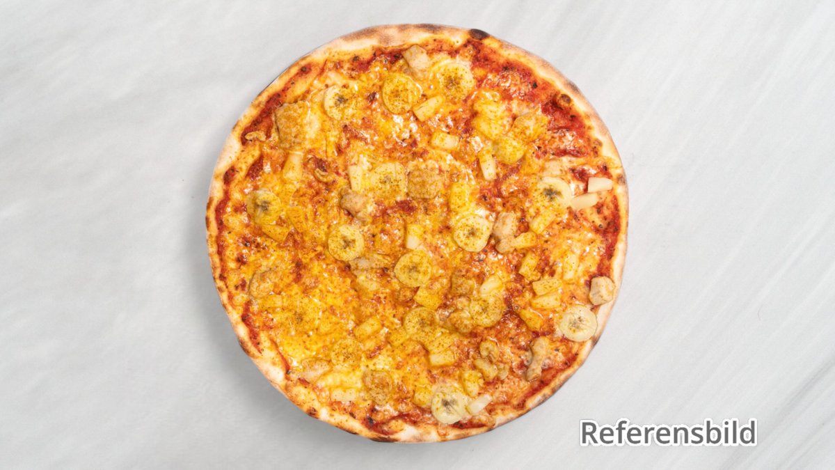 Tomatsås, ost, kebab, skinka, ananas, feferoni och valfri sås.