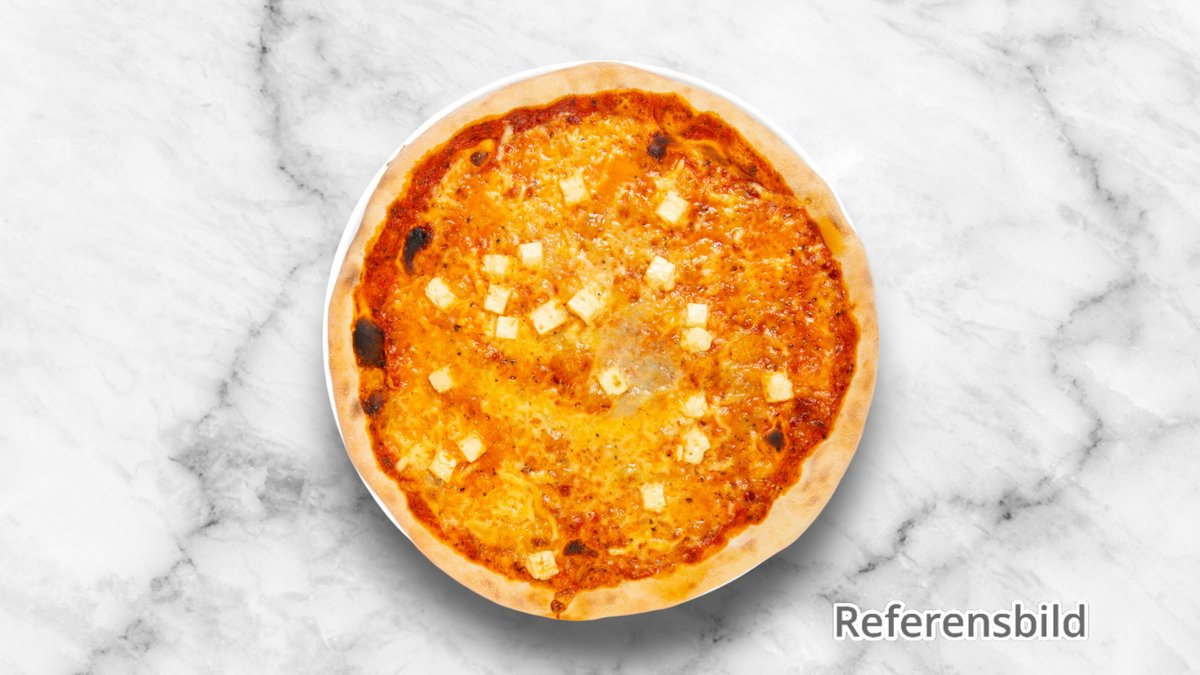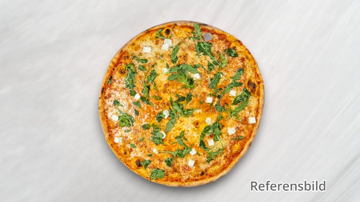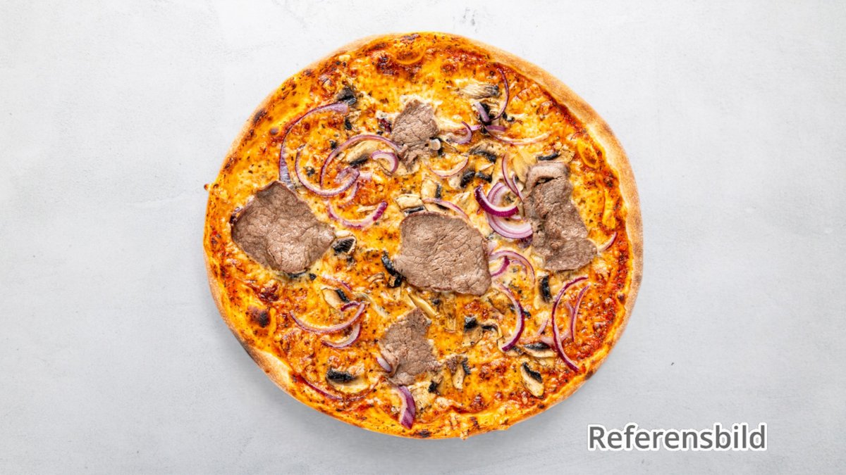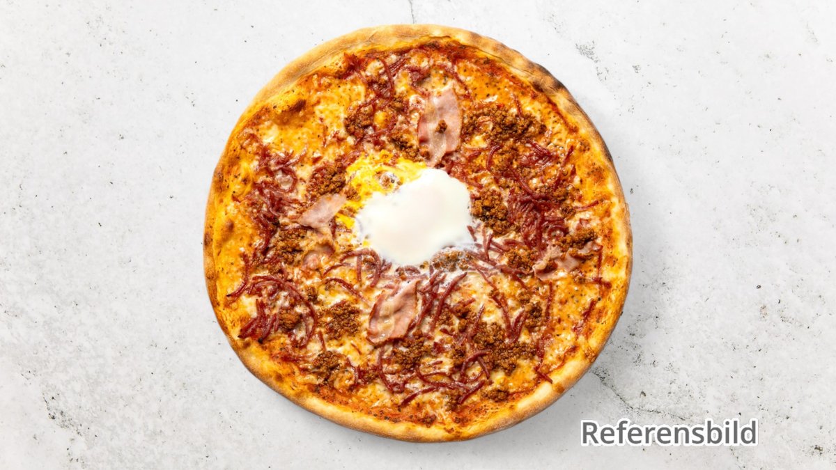 Tomatsås, ost, kebab, skinka, ananas, feferoni och valfri sås.