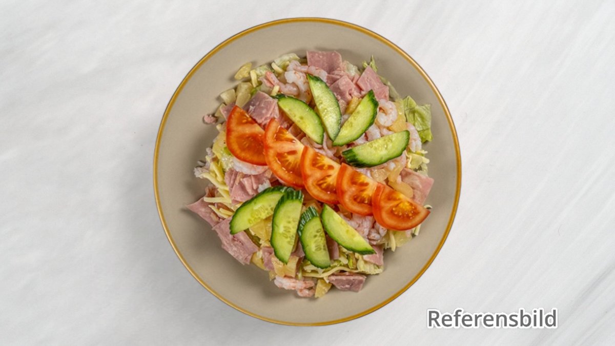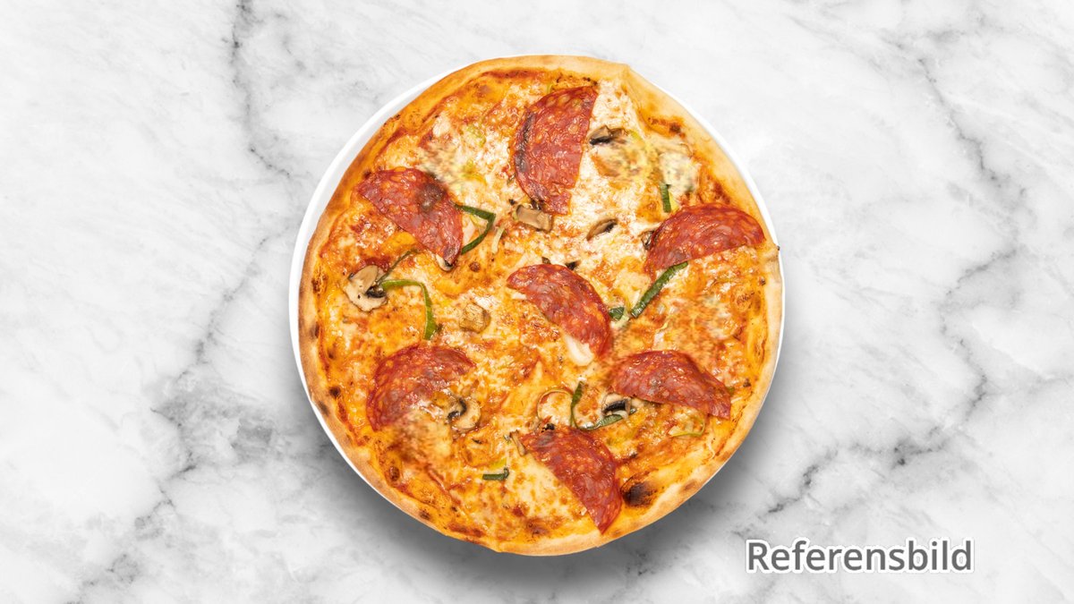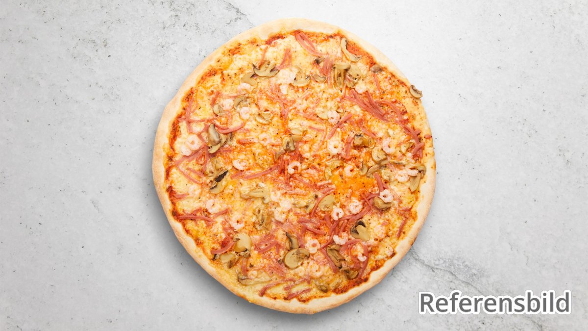 Skinka, räkor, champinjoner, oliver och kronärtskocka.