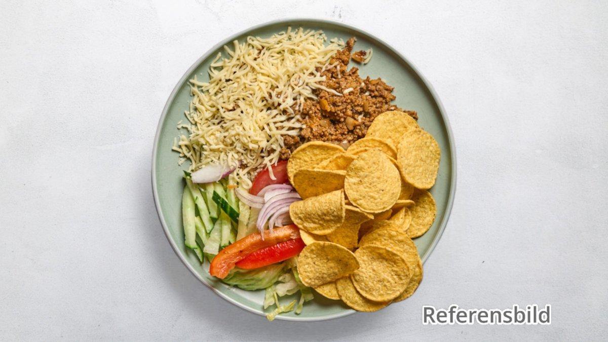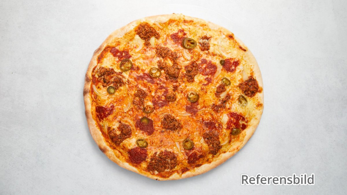Skinka, köttfärs, jalapeños, gräddfil, blandad sås och tacosås.