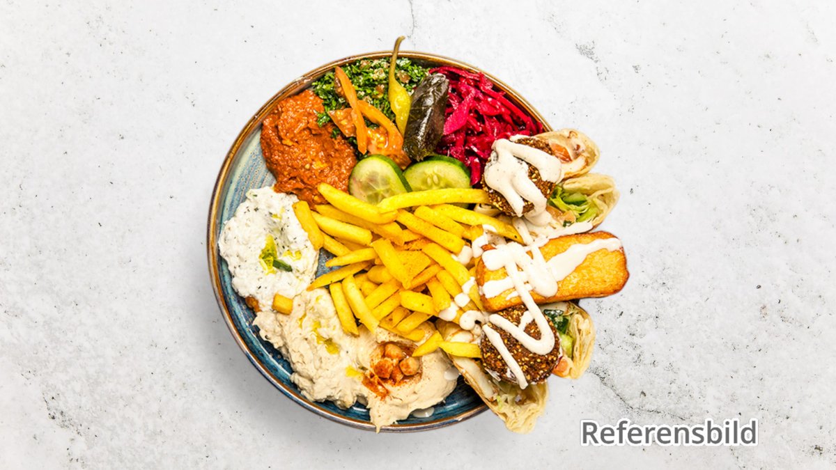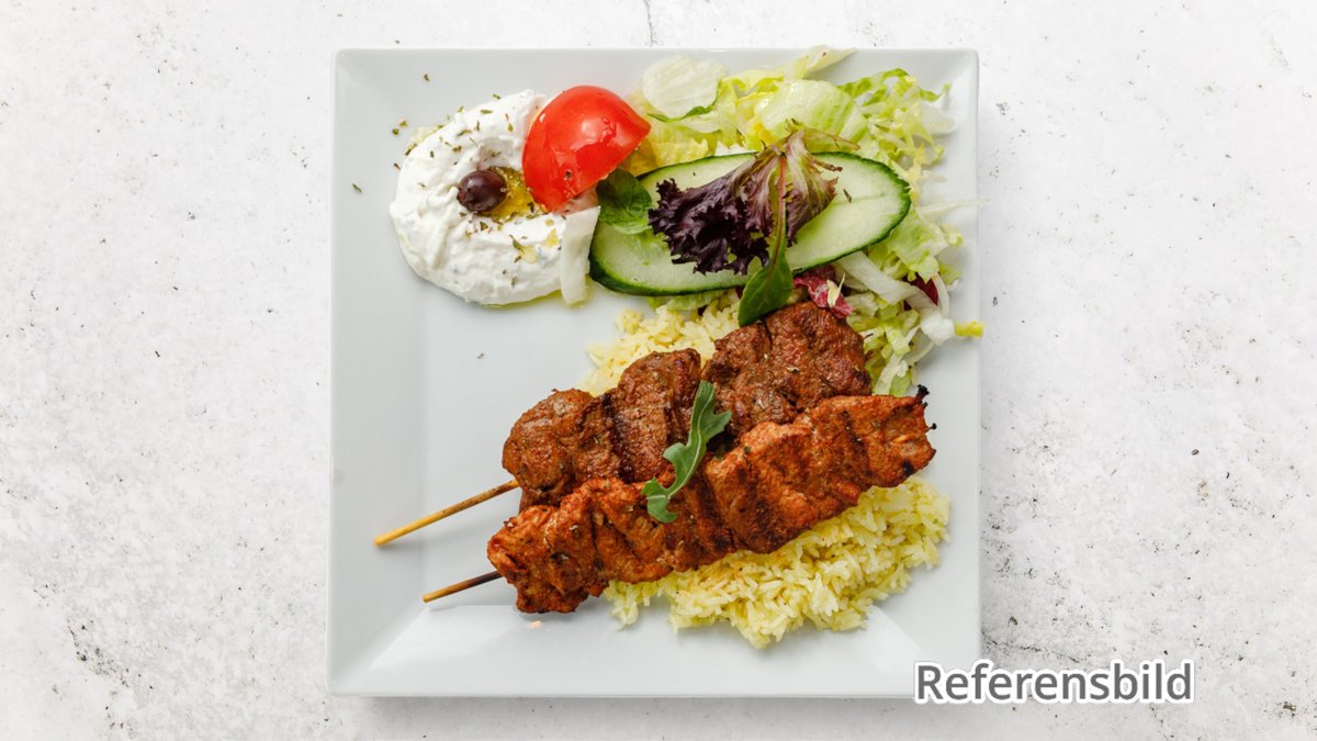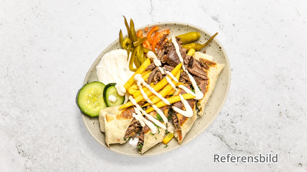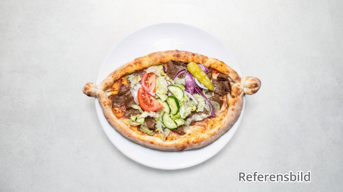 Inbakad. Tomatsås, ost, kebab, sallad, lök, tomat, gurka, feferoni och valfri sås.
