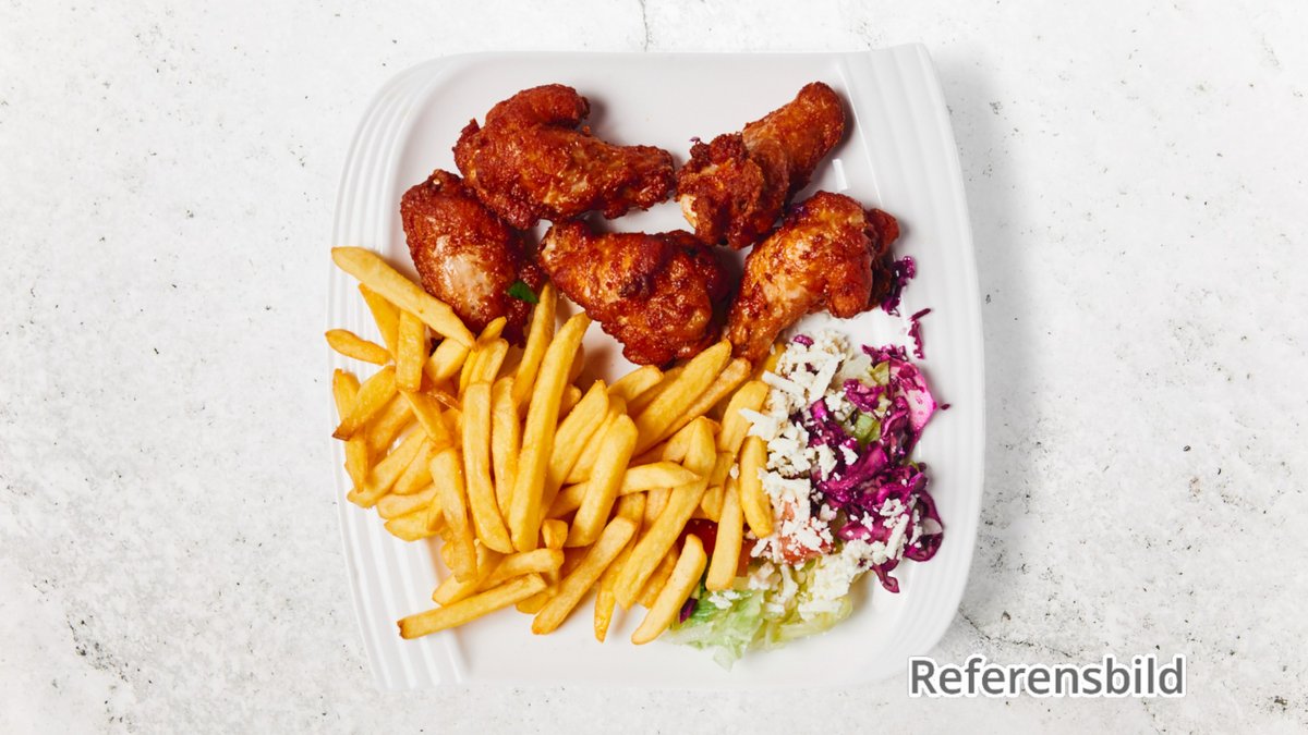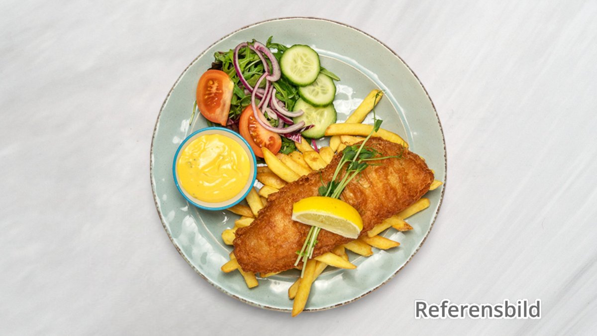 Fiskpanetter, citron, grönsaker och valfri sås. Välj tillbehör i nästa steg.