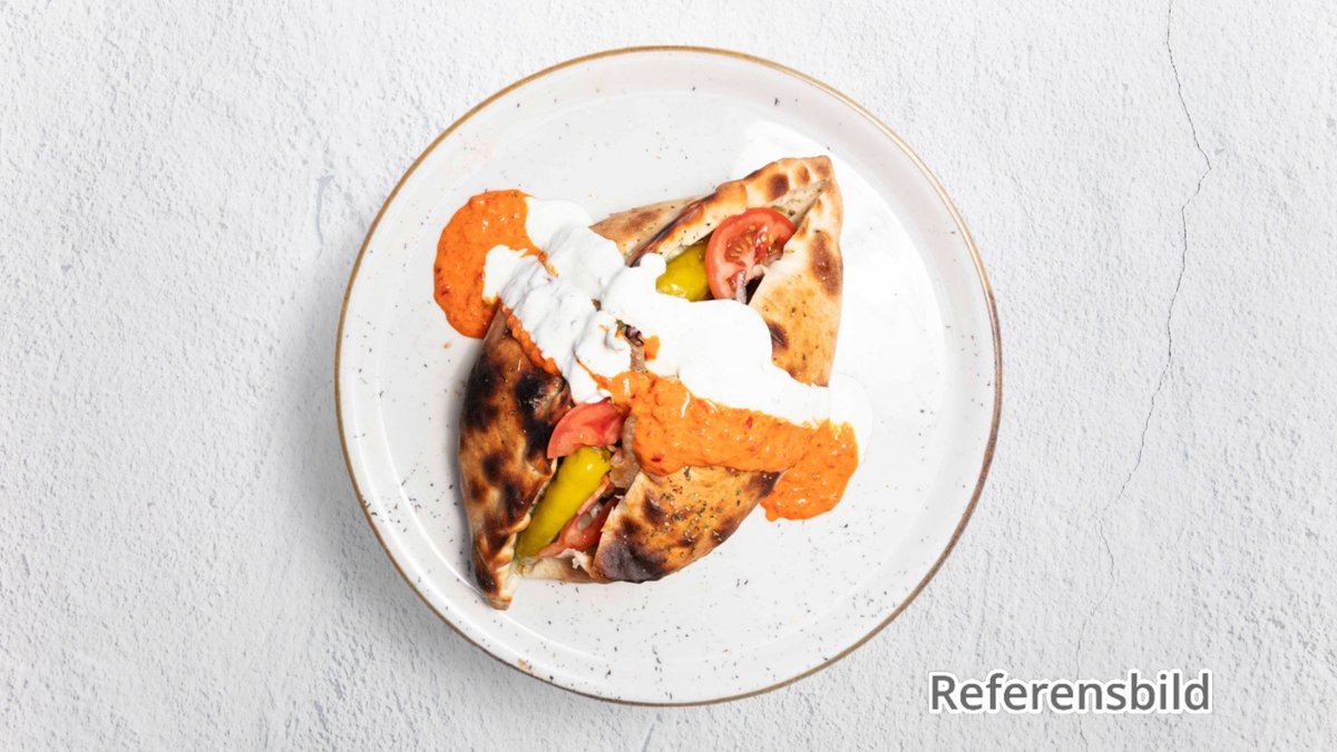 Kebabkött, grönsaker och sås i rulle. Välj sås i nästa steg.