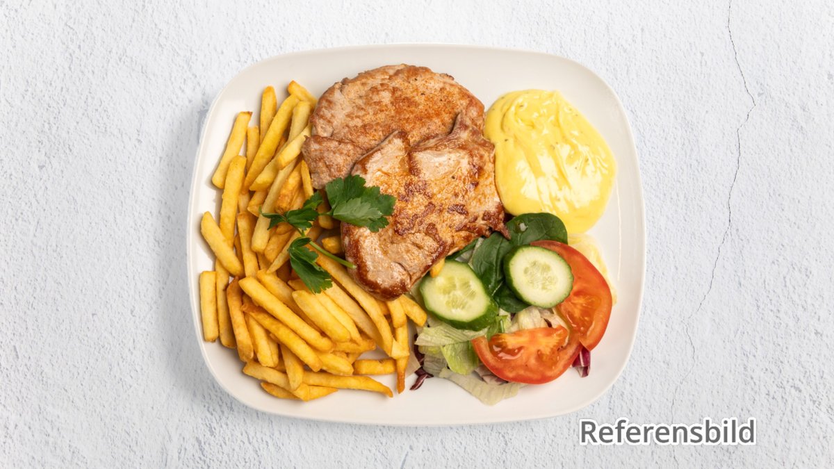 Serveras med pommes och valfri sås. Välj sås i nästa steg.