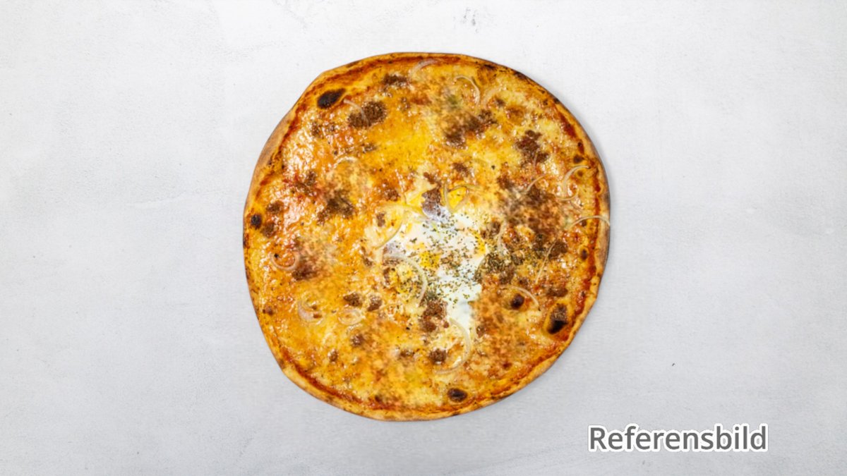 Tomatsås, ost, skinka, köttfärs och ägg.