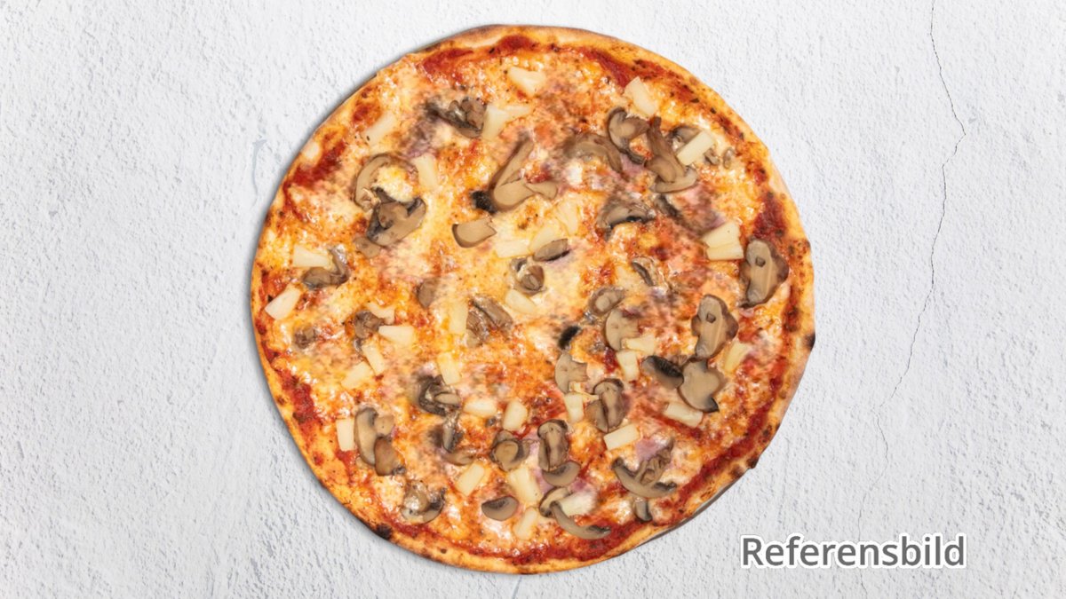 Tomatsås, ost, skinka, ananas och champinjoner.