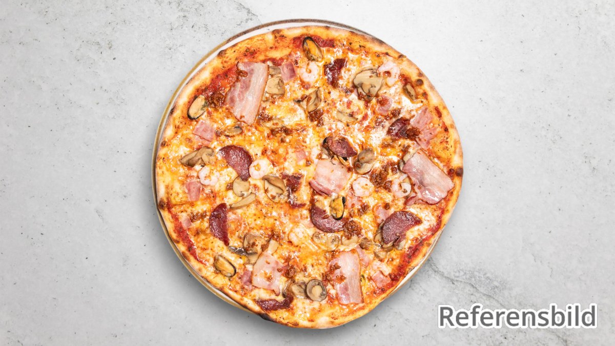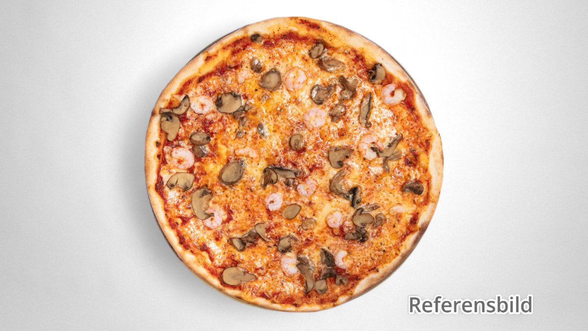 Tomatsås, ost, skinka, räkor och champinjoner.