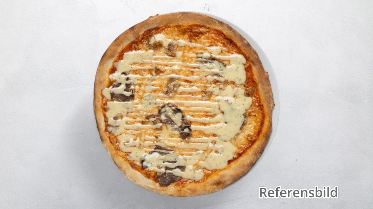 Tomatsås, ost, oxfilé, tomat, lök och gorgonzola.