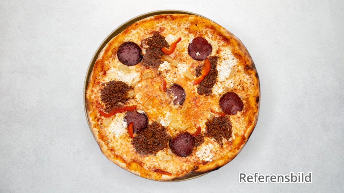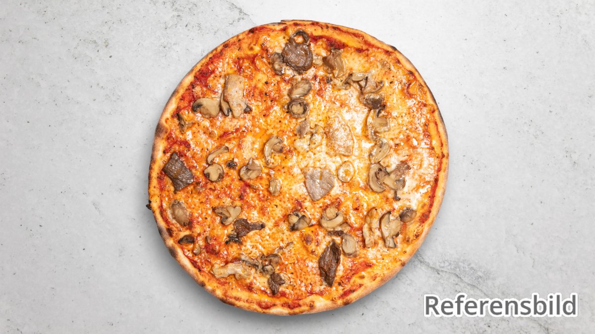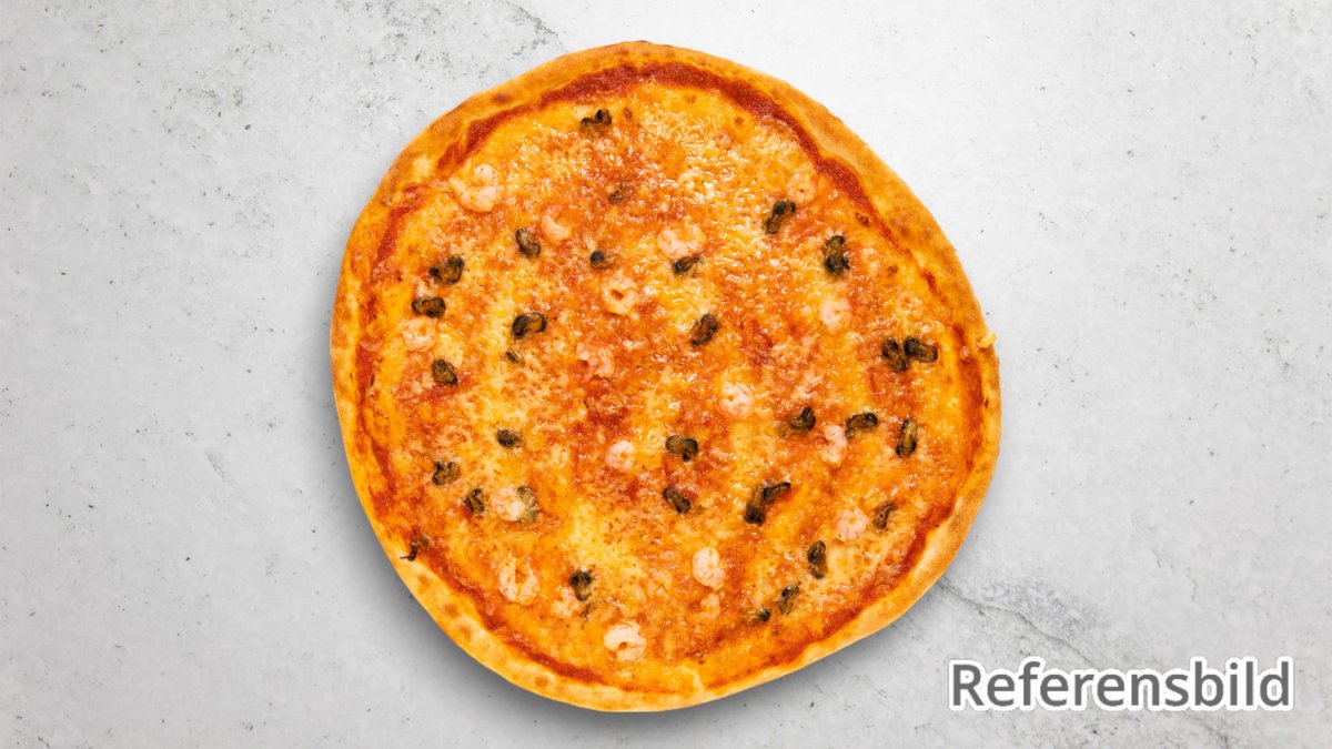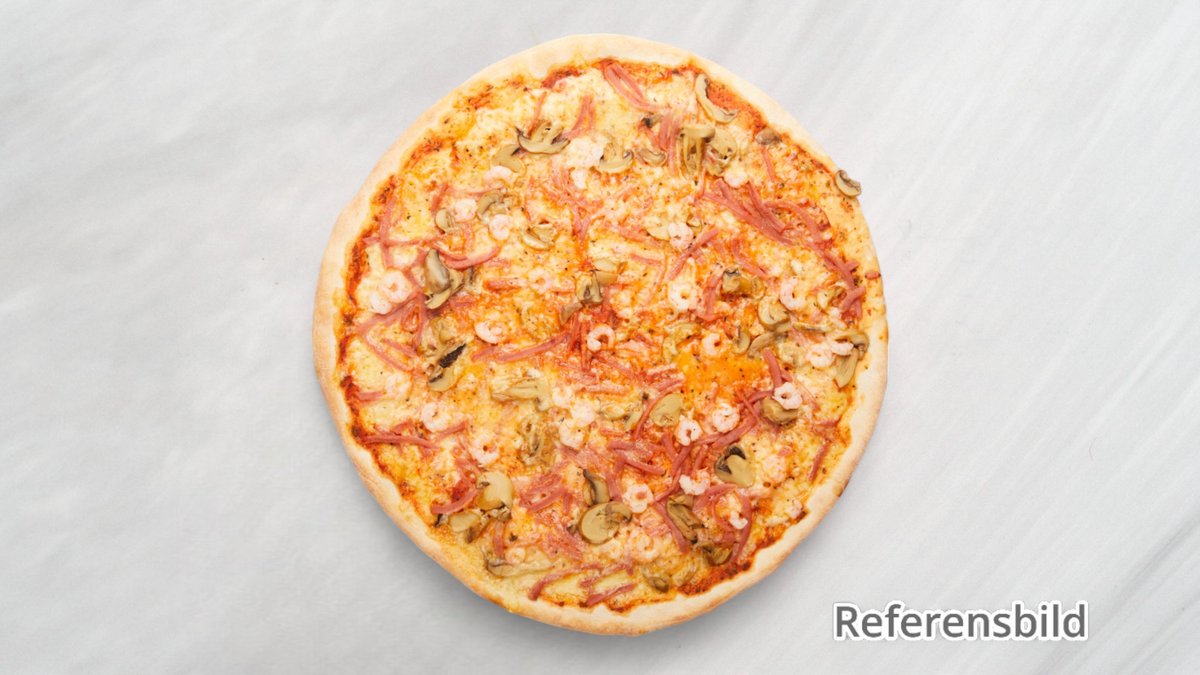 Tomatsås, ost, champinjoner, räkor, skinka, oliver och kronärtskocka.