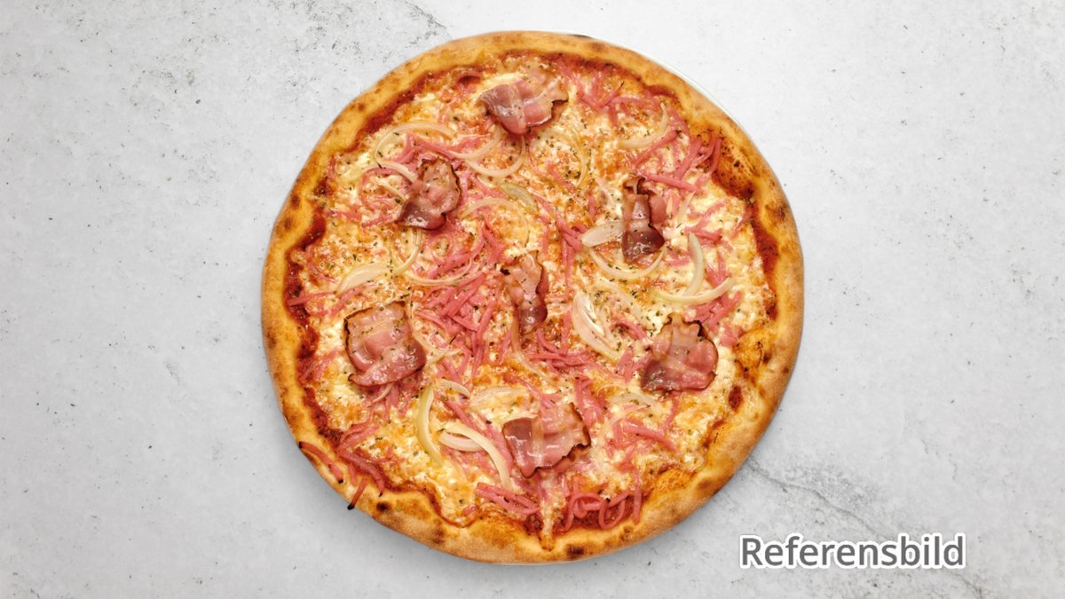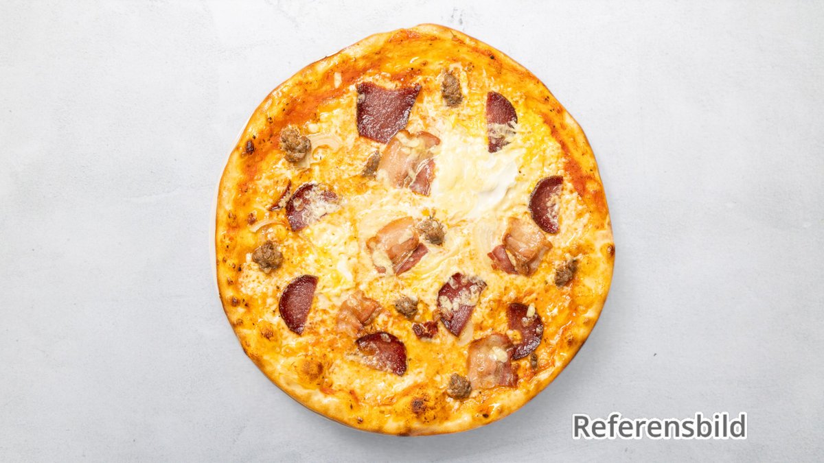 Tomatsås, ost, bacon, köttfärs, salami, lök, oliver och vitlökssås.