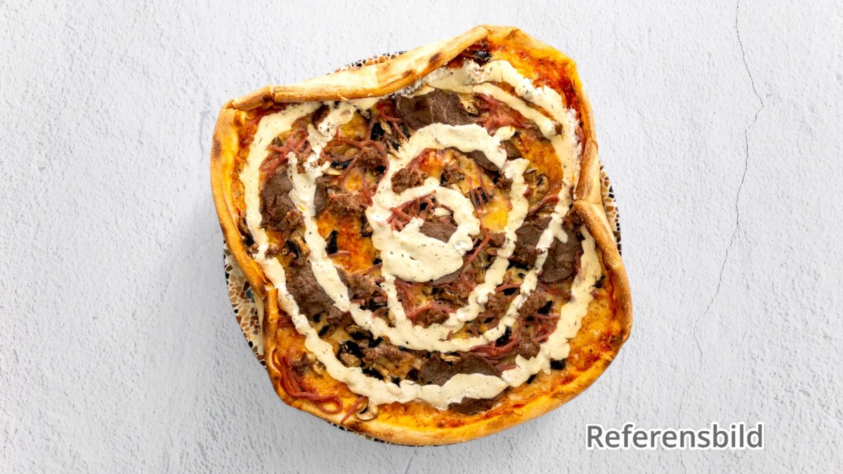 Pizza med tomatsås, ost, oxfilé, tomater, lök, kantareller och vitlökssås.