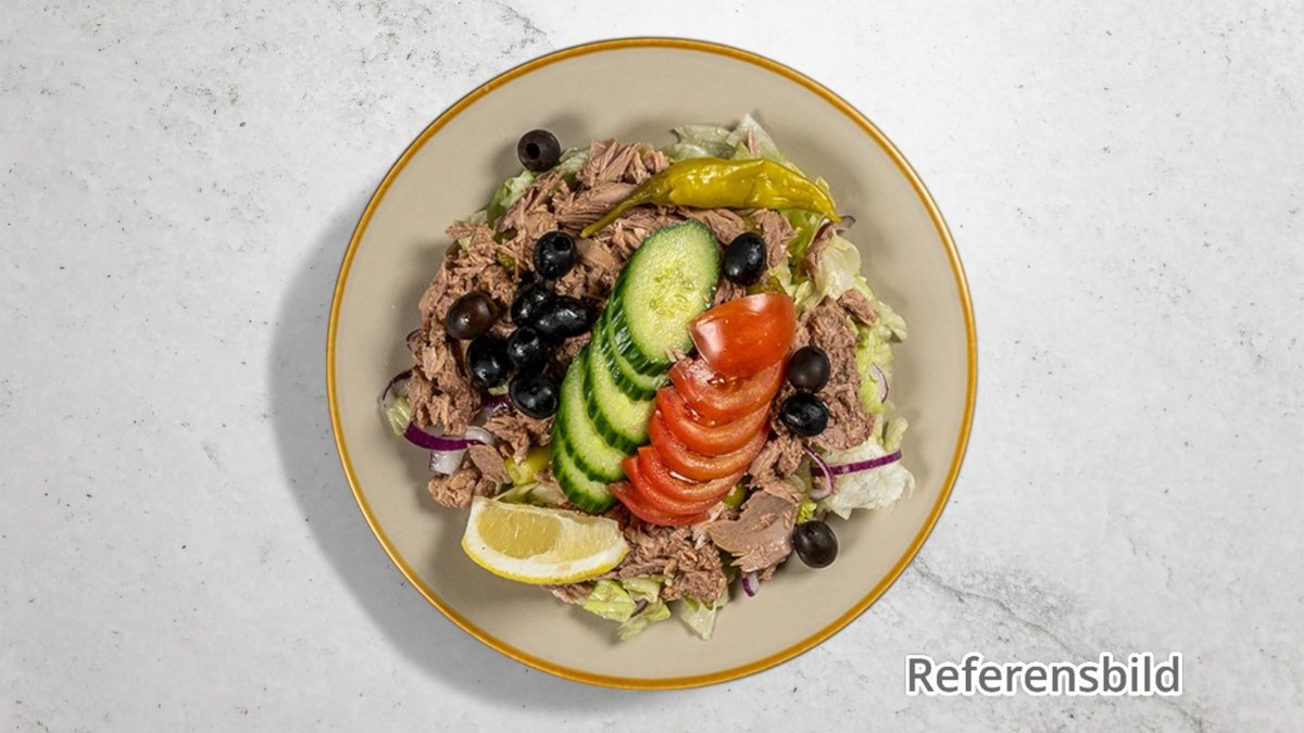 Sallad med tonfisk, oliver, paprika, lök, rhode islandsås, gurka, isbergssallad och tomater.