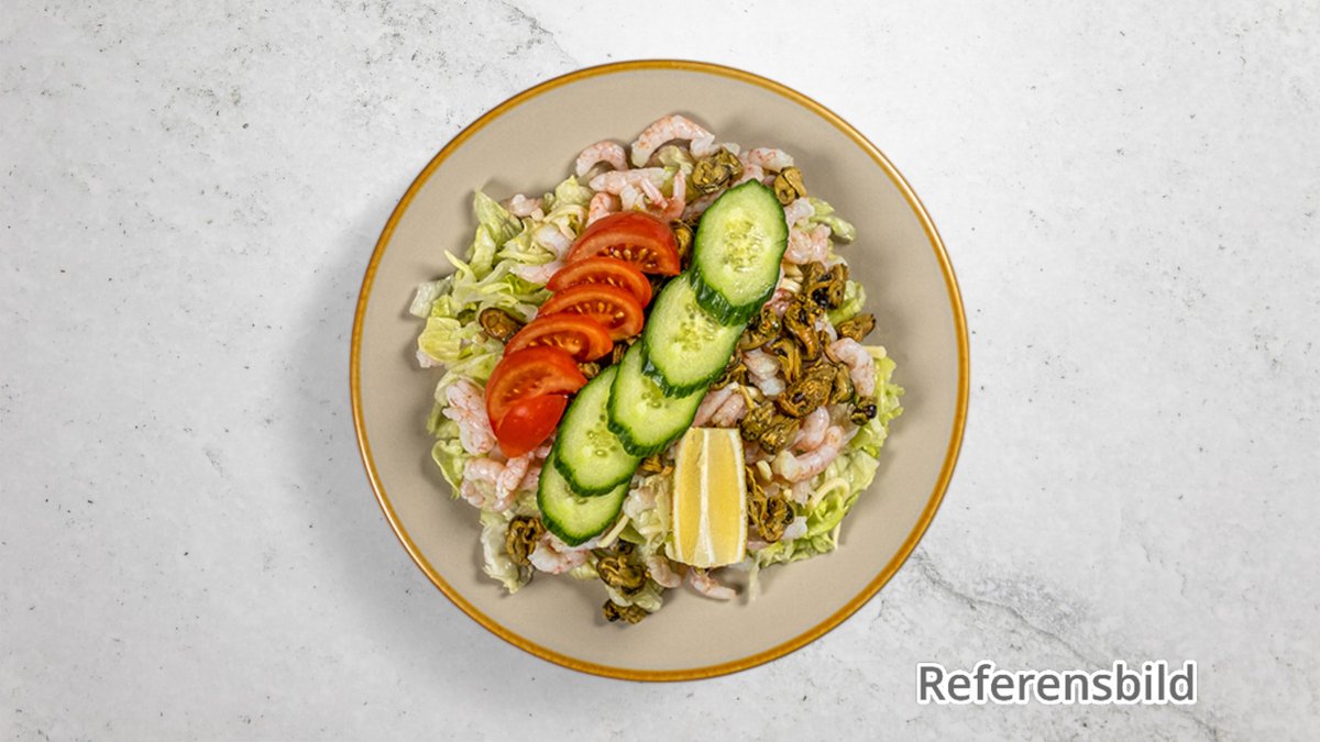 Sallad med ost, champinjoner, räkor, musslor, rhode islandsås, gurka, isbergssallad och tomater.