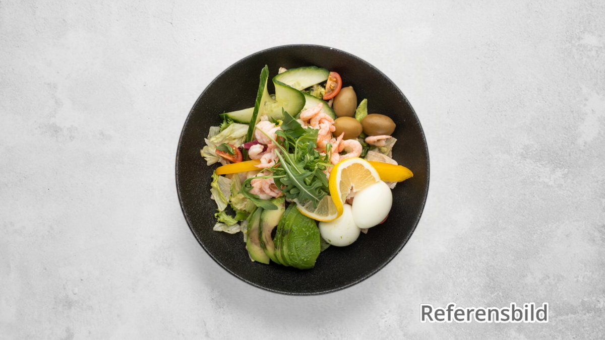 Sallad med ost, avokado, champinjoner, räkor, skinka, rhode islandsås, ägg, gurka, isbergssallad och tomater.