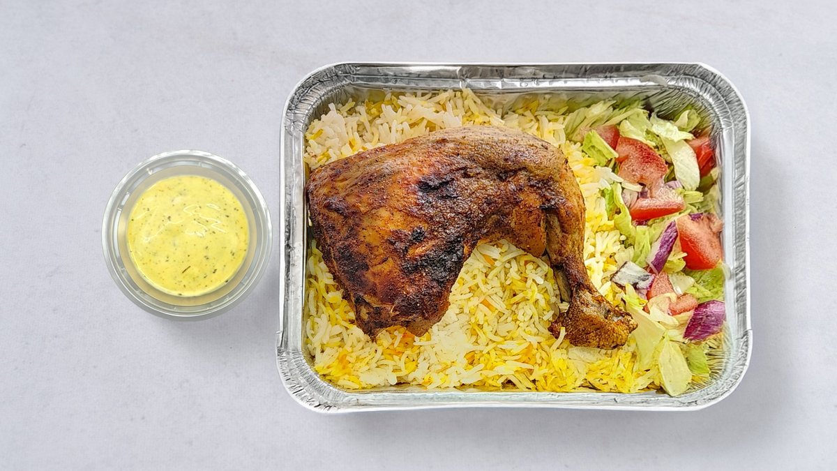 Pommes, sallad, friterad kyckling, hummus och sås.